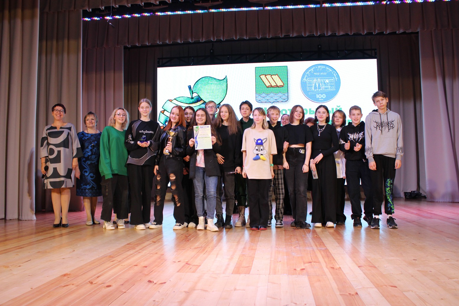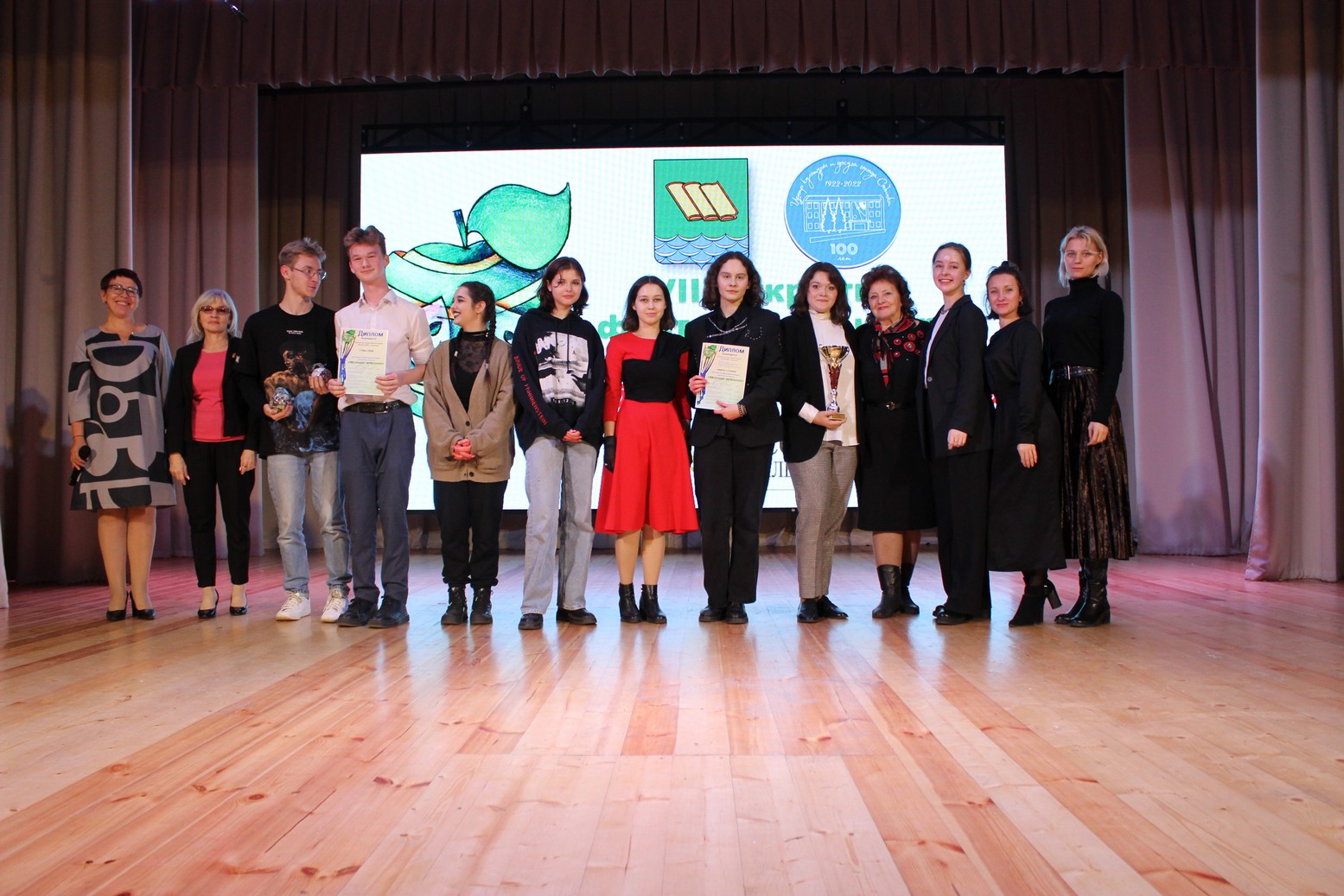 Финальное фото фестиваля. Все счастливые – потому что в руках заветное яблоко и диплом победителя или призера. И одновременно грустные – потому что праздник творчества завершен и нужно возвращаться домой. Но время летит быстро, поэтому…
