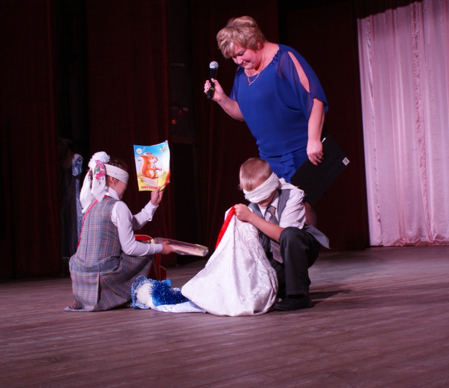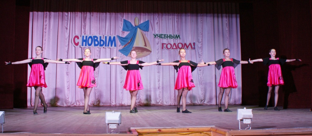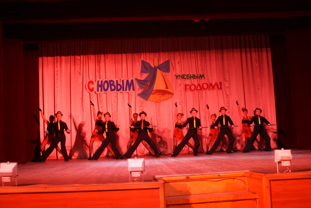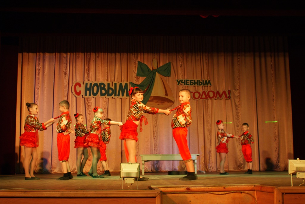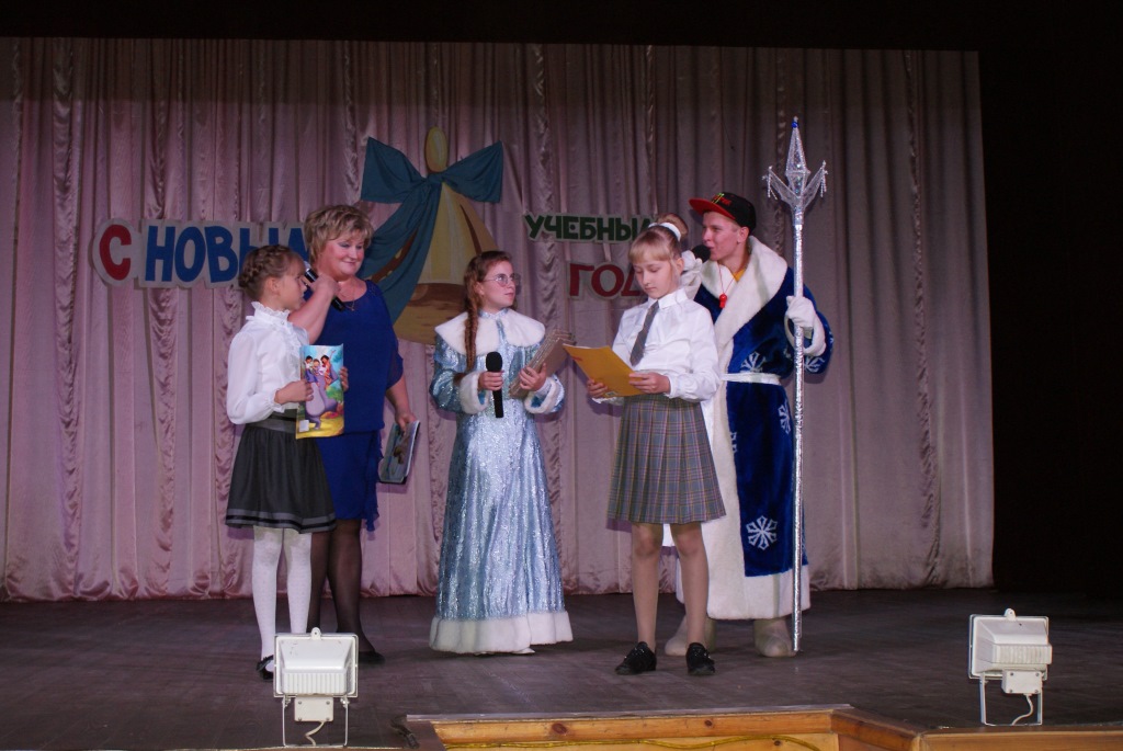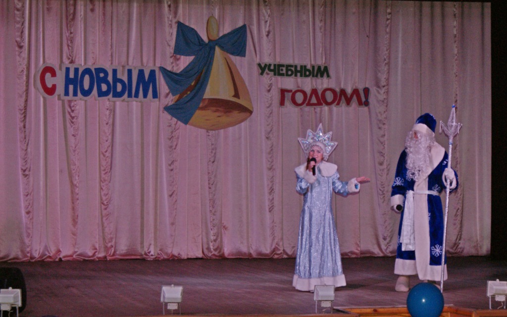 Зажигательный танец «Самба» открыл представление и юные зрители с восторгом и удивлением, бурными аплодисментами встретили появление на сцене Деда Мороза (Мельничук Андрей) и Снегурочки (Хлудова Таня). По задумке организатора (Боубатрын С.В.) эти любимые детьми герои перепутали Новый год с Новым УЧЕБНЫМ годом, на этом и был выстроен весь ход праздника. Дети участвовали в конкурсах, которые им предлагали Дед Мороз, Снегурочка и Ведущая: разбирали мешок с подарками, где перемешались Новогодние и школьные предметы; наряжали ДОСОЧКУ и зажигали на ней огни; и, встав в хоровод, пели песенку «В лесу родилась досочка». Дед Мороз и Снегурочка устроили ребятам самый настоящий Новый год, но только учебный. Снегурочка предложила ребятам немного пофантазировать и провела игру: «Что бы вы хотели кушать в школе?» Победители конкурса были назначены главными по школьной столовой. Зазвенел звонок, юные зрители загадали желание на новый учебный год, а учителя поздравили и напутствовали ребят. В процессе представления Дед Мороз превратился в учителя физкультуры, а Снегурочка в учительницу начальных классов, и они пригласили всех на весёлую переменку. В программе принимали участие танцевальные коллективы ГДК "Эврика» (Малова Г.Г.), «Экспрессия» (Мужикова А.В.), «Импульс» (Кудрявая Л.А.) и Алиса Табанюк.