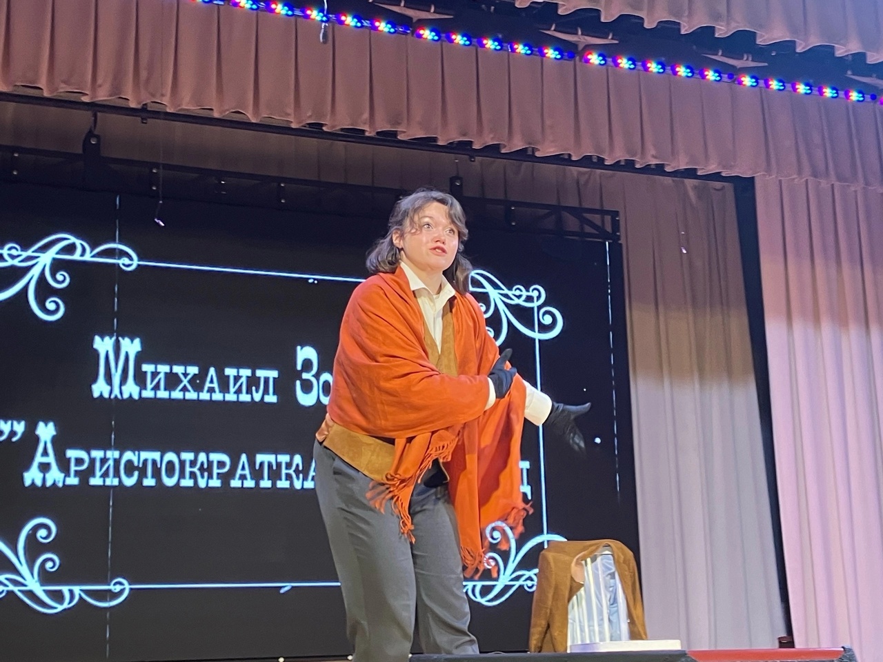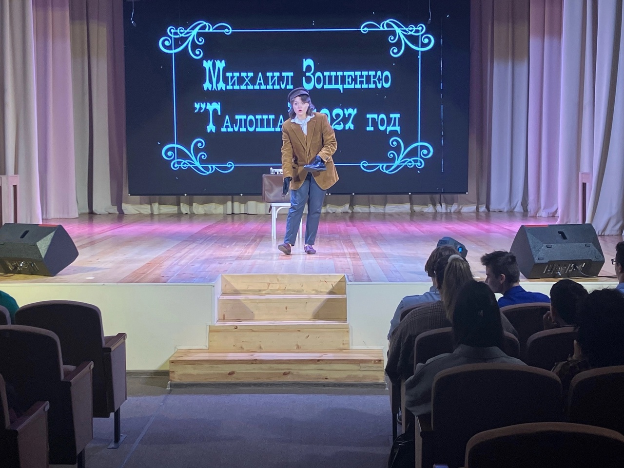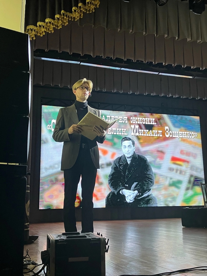 24 ноября на сцене Дома культуры была рассказана жизнь Михаила Михайловича. Параллельно были представлены его рассказы: «Галоша», «Аристократка», «История болезни» - в виде моноспектакля в исполнении участницы театральной студии «Жёлтый Жираф» города Владимир Виктории Жарёновой. Театральный коллектив «Балаган» представил фрагмент из фильма «Не может быть!» по мотивам рассказа Зощенко «Свадебное происшествие». Образы центральных героев получились запоминающимися. Мамашу в точности передала Ксения Соловьёва. Папашу сыграл руководитель коллектива Вячеслав Карпов. Роль Володьки Завитушкина досталась Никите Дёмину, а роль невесты, которую не узнавал Володя без шляпки и пальто, сыграла Алиса Табанюк. Зритель искренне смеялся над нелепостями, в которые попадали герои Зощенко.