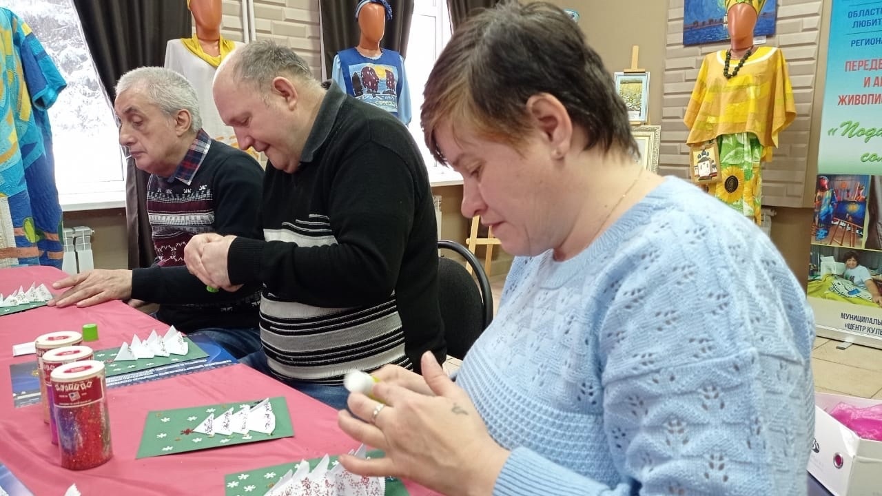 Но на этом дружба не закончилась. Через день проживающие Собинского интерната стали участниками мастер-класса по изготовлению новогодней открытки и экскурсии на выставку художников Собинского края «Осенний блюз». Проживающие Собинского интерната подхватили творческую эстафету, тоже став участниками мастер-класса.