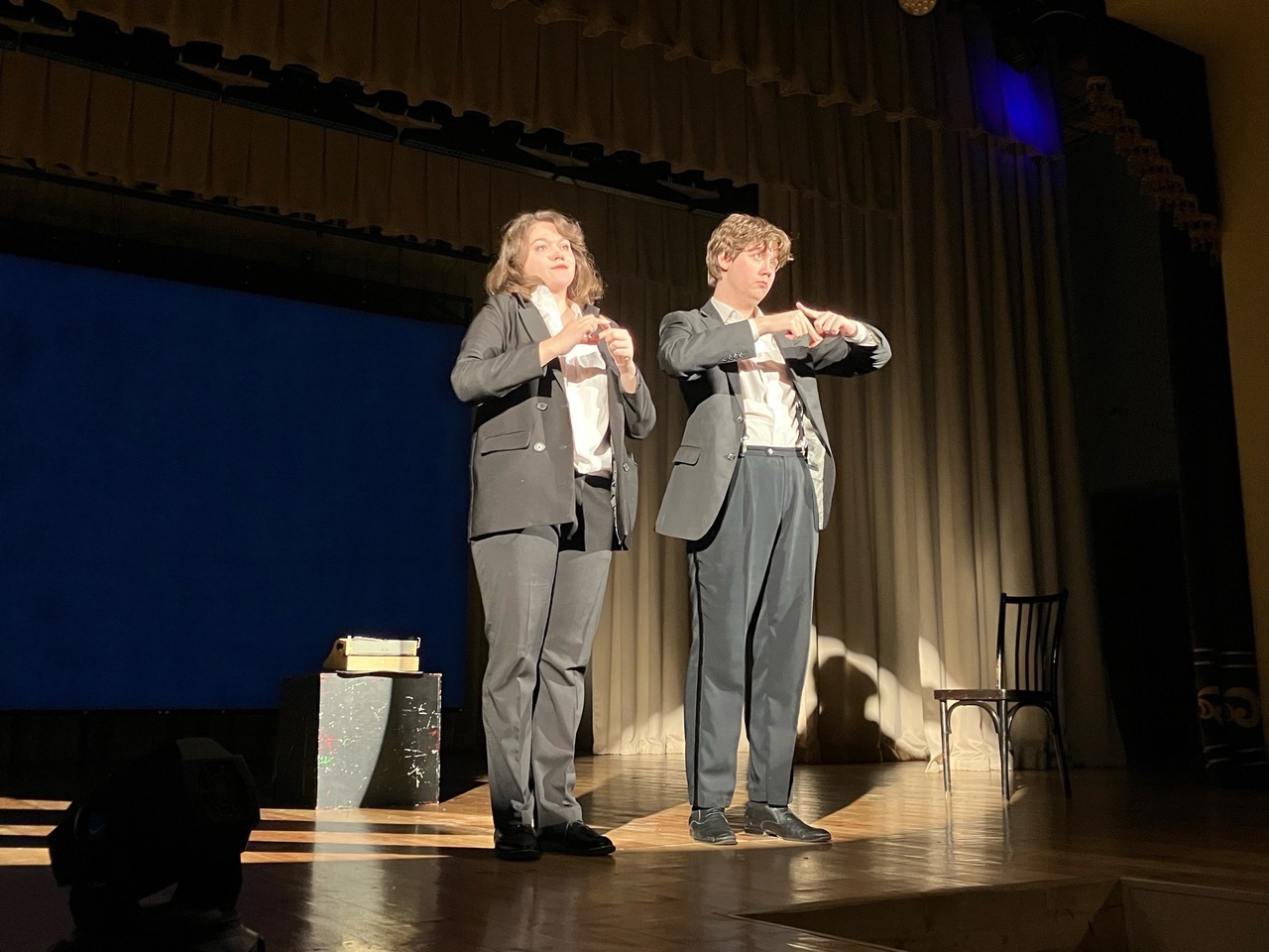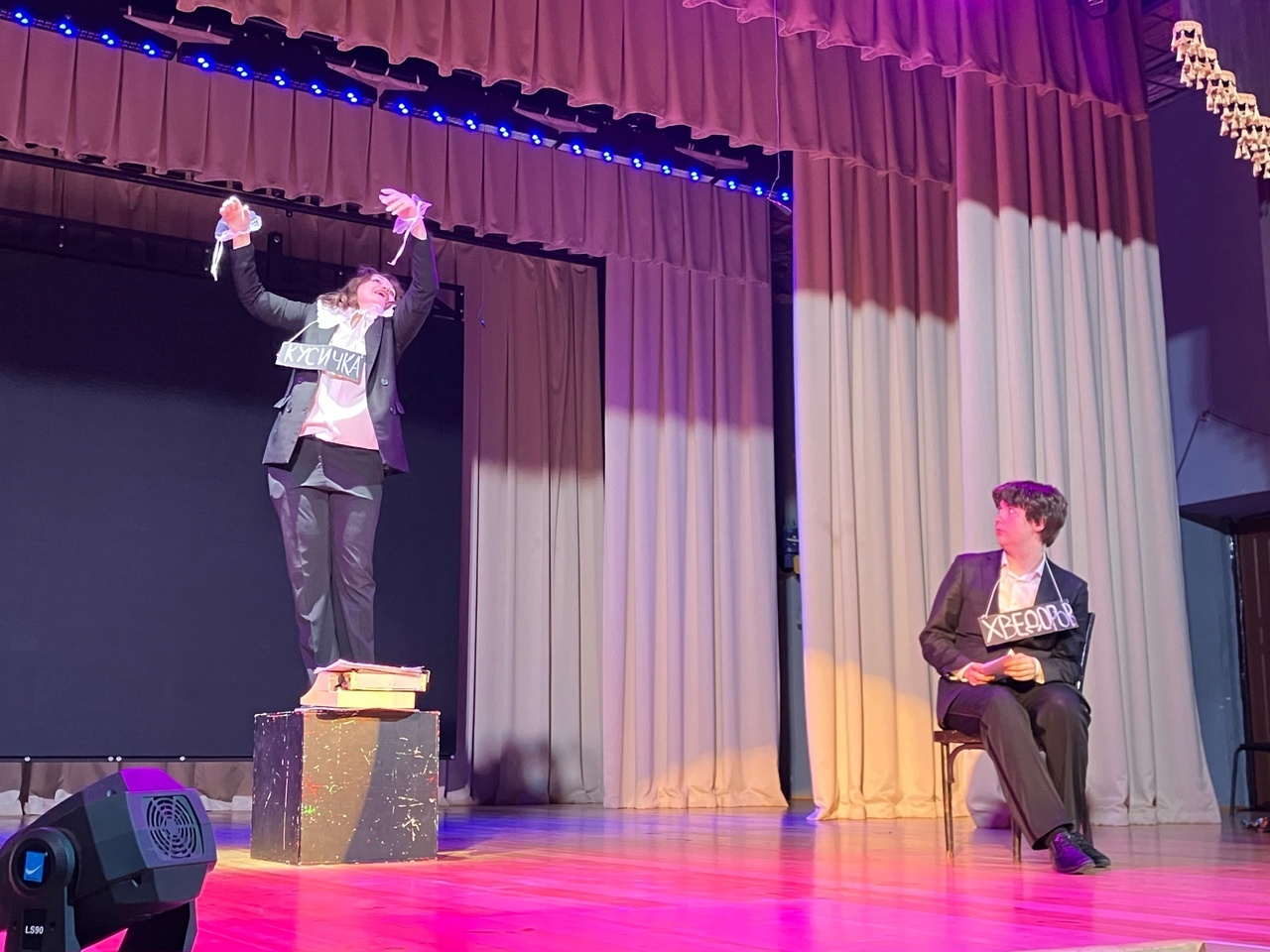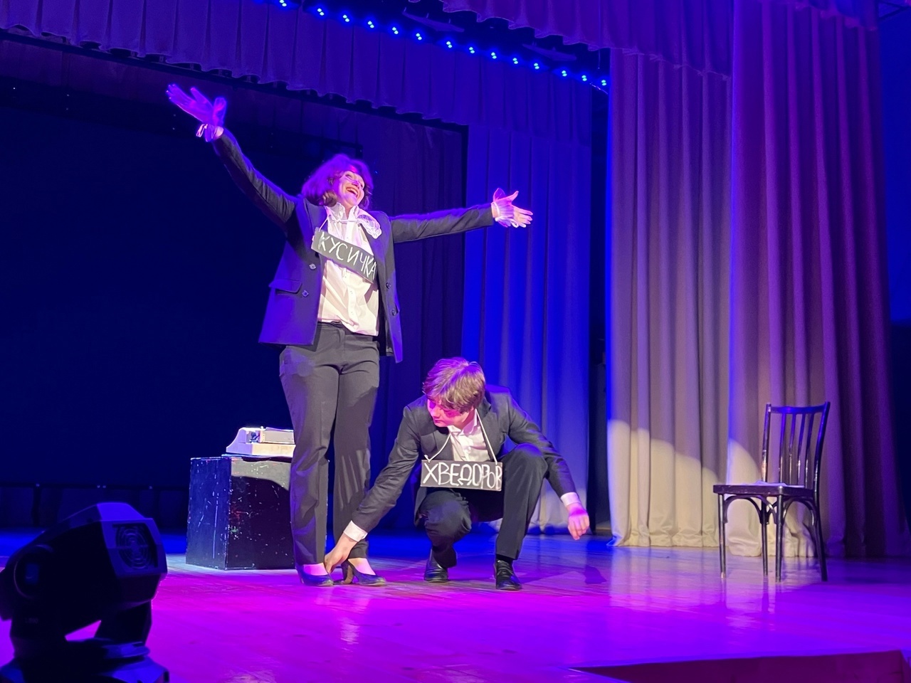 Эти очерки были рассказаны всего двумя артистами – Вячеславом Карповым и Викторией Жарёновой. Игра актёров была на высшем уровне. Режиссёрское решение спектакля – надевать таблички, на которых были написаны имена персонажей, в которых перевоплощались актёры, было интересным и даже комичным. Молодой и уже опытный зритель рукоплескал и смеялся. Заряд хорошего настроения получили все.