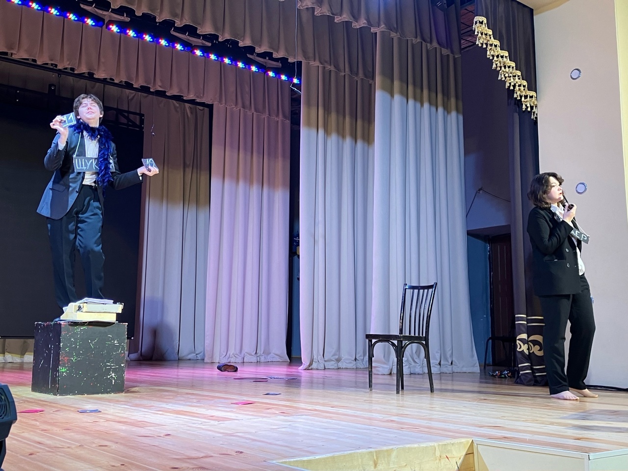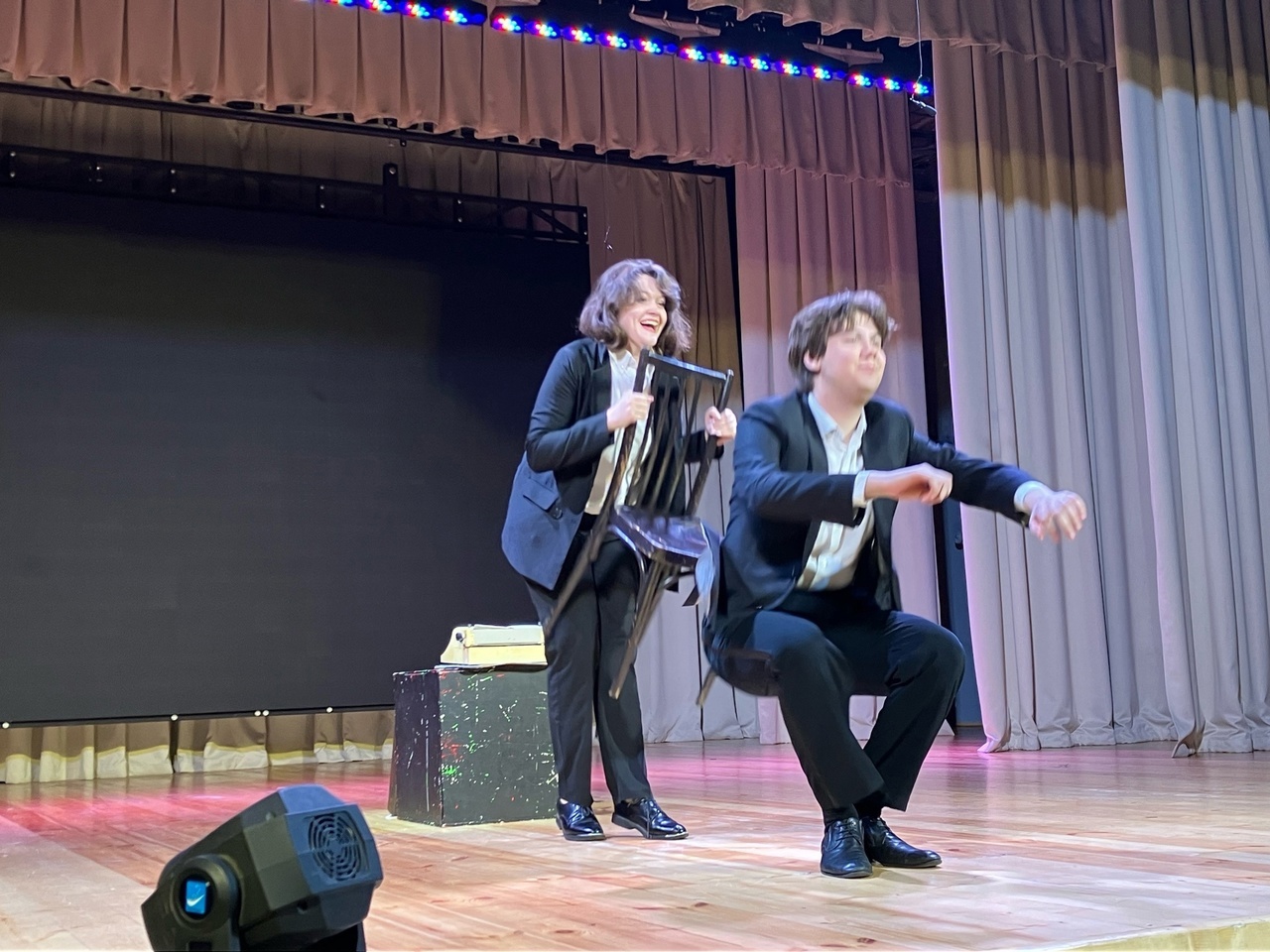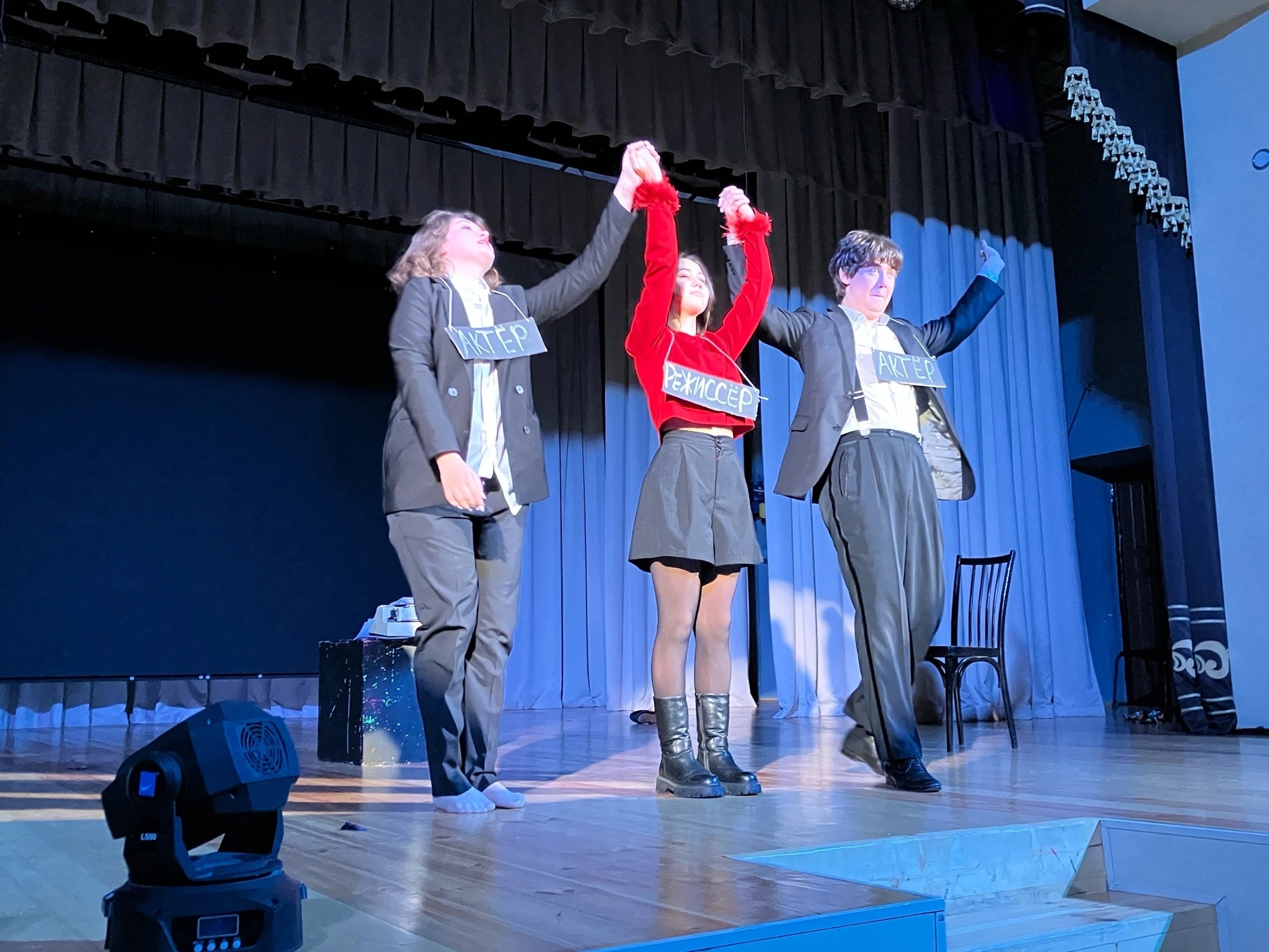 Эти очерки были рассказаны всего двумя артистами – Вячеславом Карповым и Викторией Жарёновой. Игра актёров была на высшем уровне. Режиссёрское решение спектакля – надевать таблички, на которых были написаны имена персонажей, в которых перевоплощались актёры, было интересным и даже комичным. Молодой и уже опытный зритель рукоплескал и смеялся. Заряд хорошего настроения получили все.