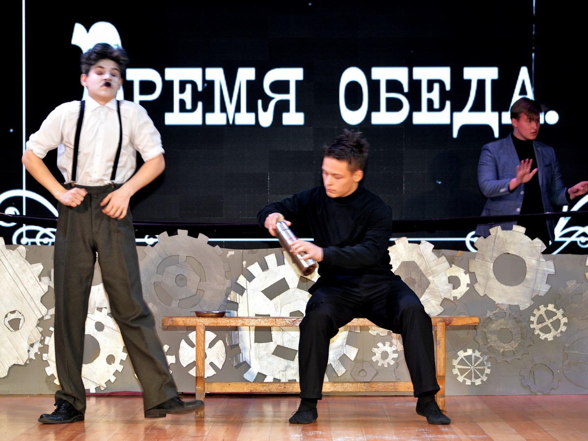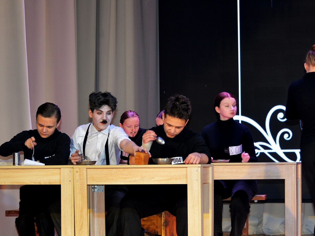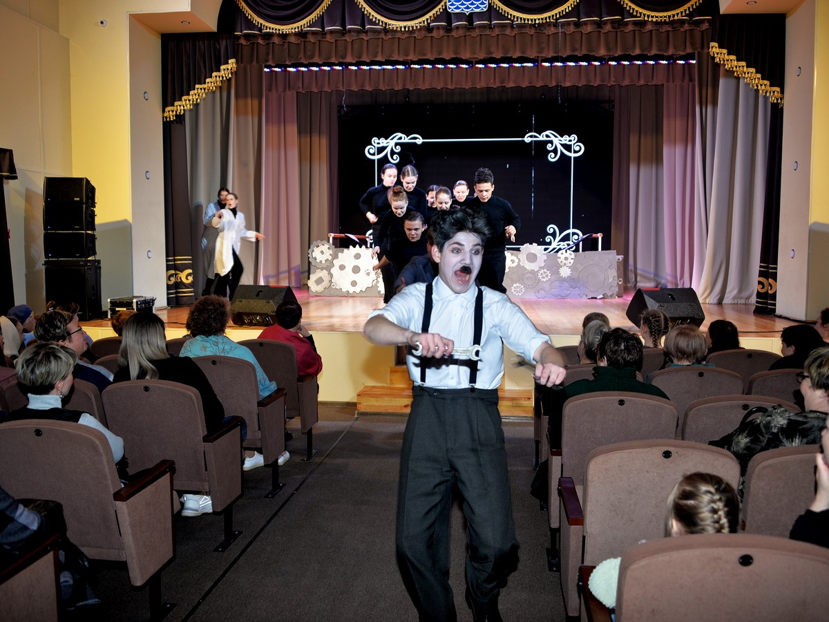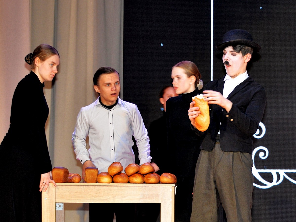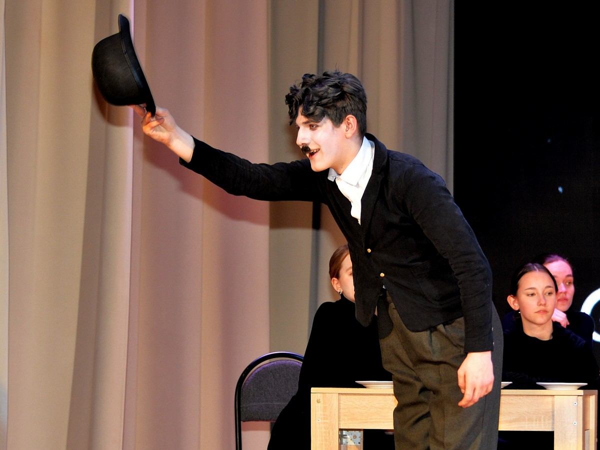 Ребята театрального коллектива «Балаган» тоже не равнодушны к искусству Чарли Чаплина. Они организовали небольшой вечер-портрет, посвящённый 135-летию великого комика. Режиссёром-постановщиком всего действа был Карпов Вячеслав. Спектакль был разбит на самые интересные сцены из фильма «Новые времена», который, по мнению режиссёра, является апофеозом карьеры и жизни Чарли Чаплина.