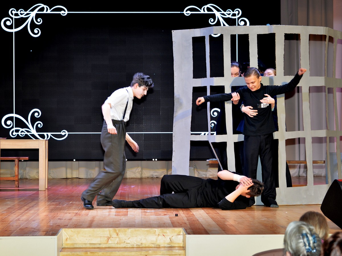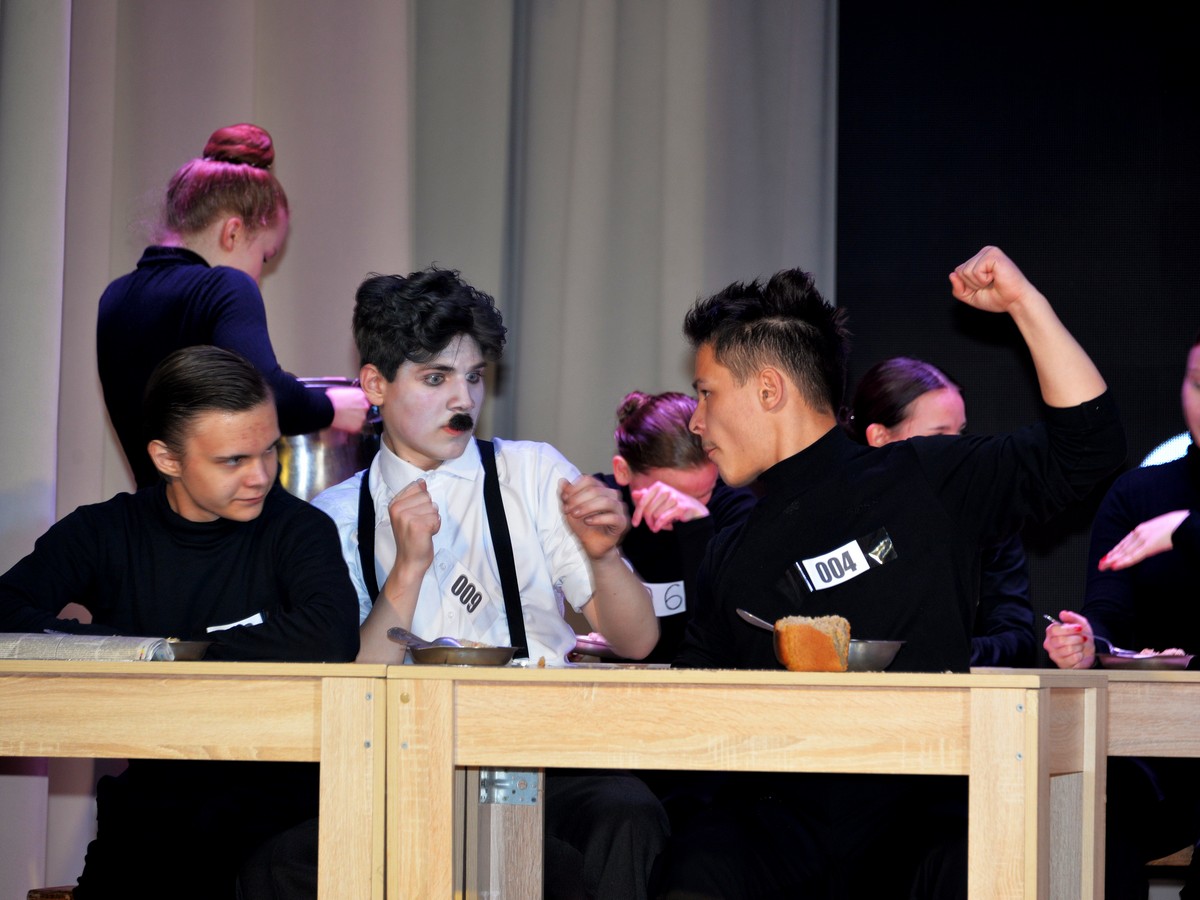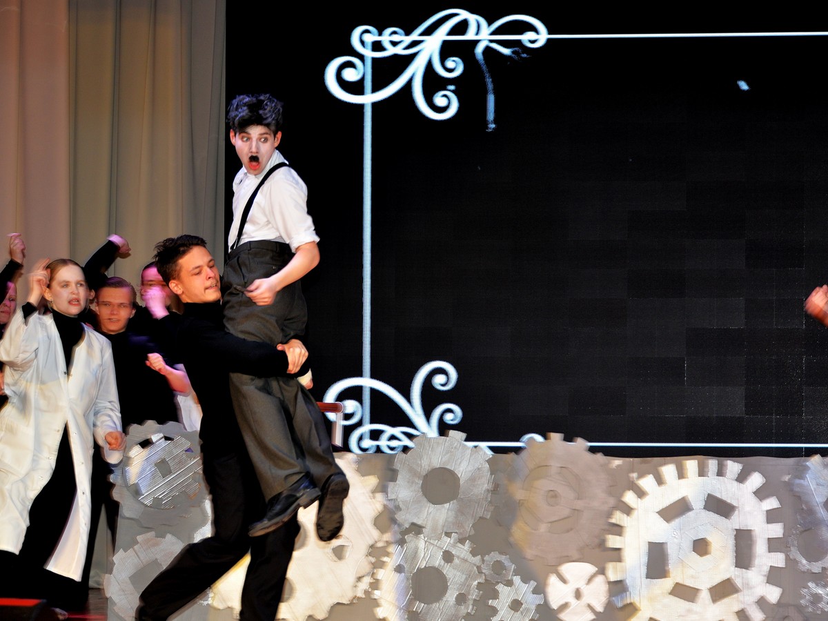 Главную роль бродяжки Чарли сыграл Дёмин Никита, а его спутницу Соловьёва Ксения. Спектакль получился смешным. Зрители хохотали несмотря на то, что сцены с Чаплиным отыгрывались полностью без слов. В конце спектакля зритель проронил слезу, так как концовка заставляет сквозь призму гротеска, юмора и буффонады задуматься о смысле жизни.