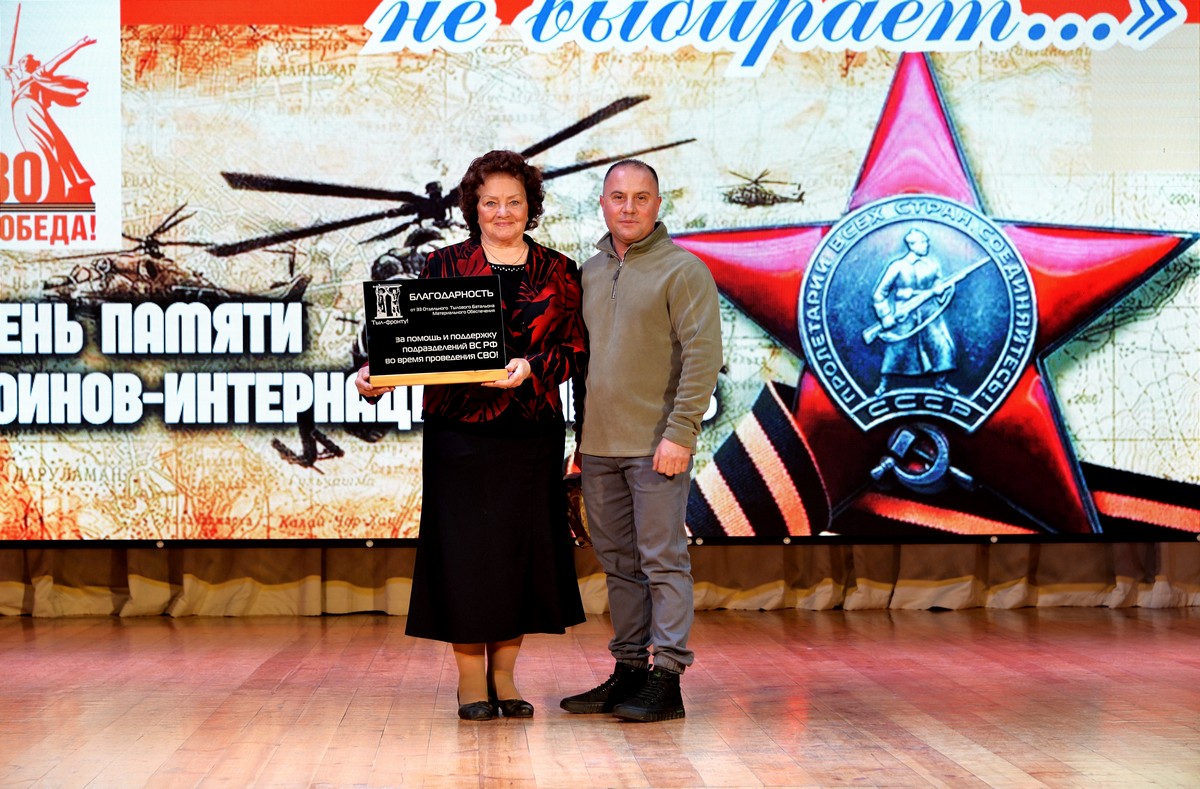 Не обошлось мероприятие и без упоминания событий сегодняшних дней – о специальной военной операции. Совет ветеранов во главе с его председателем Тамарой Сергеевной Тарасовой передали 33 отдельному тыловому батальону материального обеспечения «Тыл-фронту», возглавляемому депутатом Собинского муниципального округа Мгером Ваняном, медицинские аптечки, продукты и другие необходимые вещи. За неоднократную помощь фронту в виде гуманитарной помощи, за плетение маскировочных сетей Совет ветеранов и Центр культуры и досуга были награждены Благодарностью от тылового батальона.