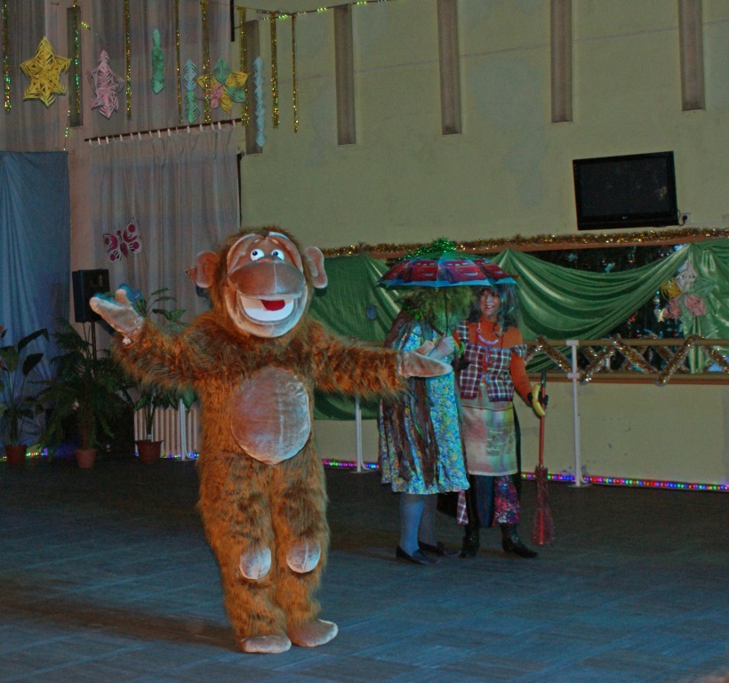Дети встретились со сказочными героями : Бабой Ягой, Кикиморой, Лешим, веселыми клоунами, жизнерадостной обезьянкой – символом наступающего года и, конечно же, с Дедом Морозом и Снегурочкой.