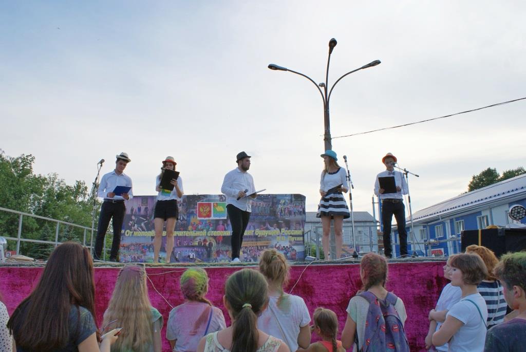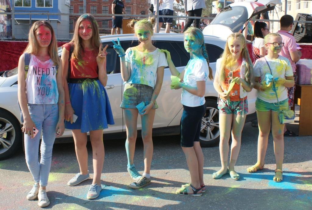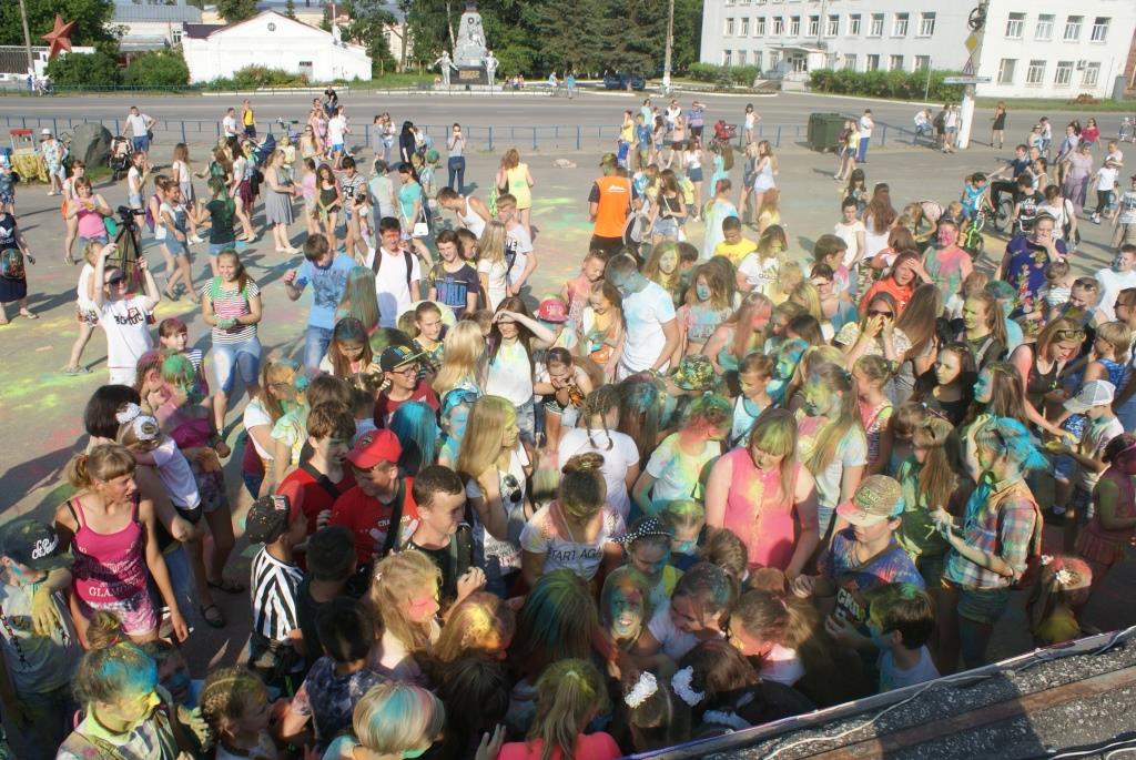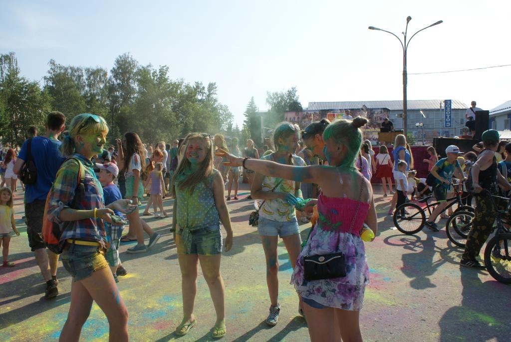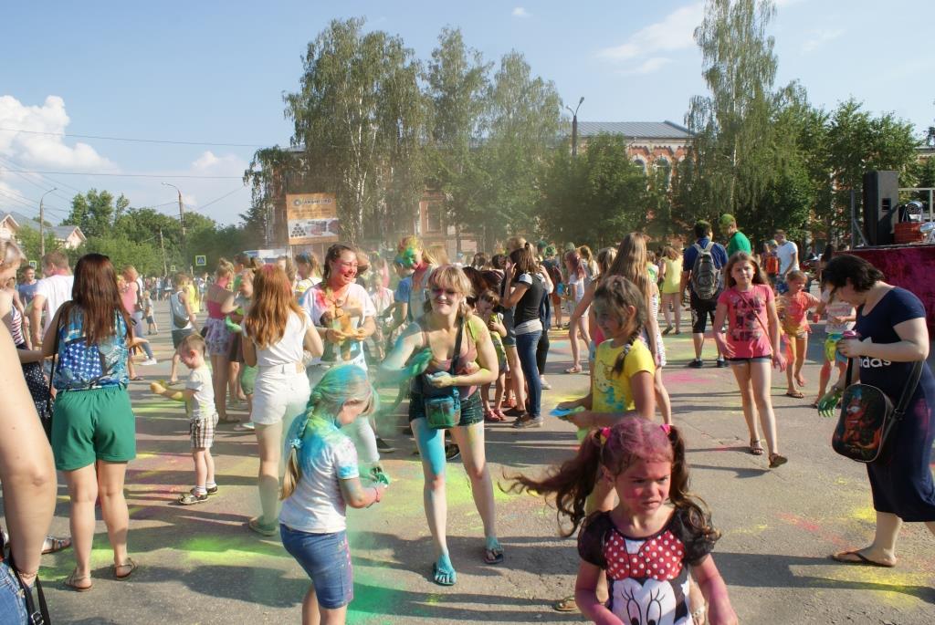 Ровно в семнадцать часов на площади началось красочное шоу - «Праздник красок Холи», которое провели гости из Нижнего Новгорода. Яркая уличная пудра раскрасила лица и одежды всех присутствующих. «Праздник красок» чередовался массовым запуском пудры с флешмобами и играми. А пока происходило это яркое действо, всем желающим предлагалось поучаствовать в перетягивании каната, беге в мешках, поиграть в «Городки».