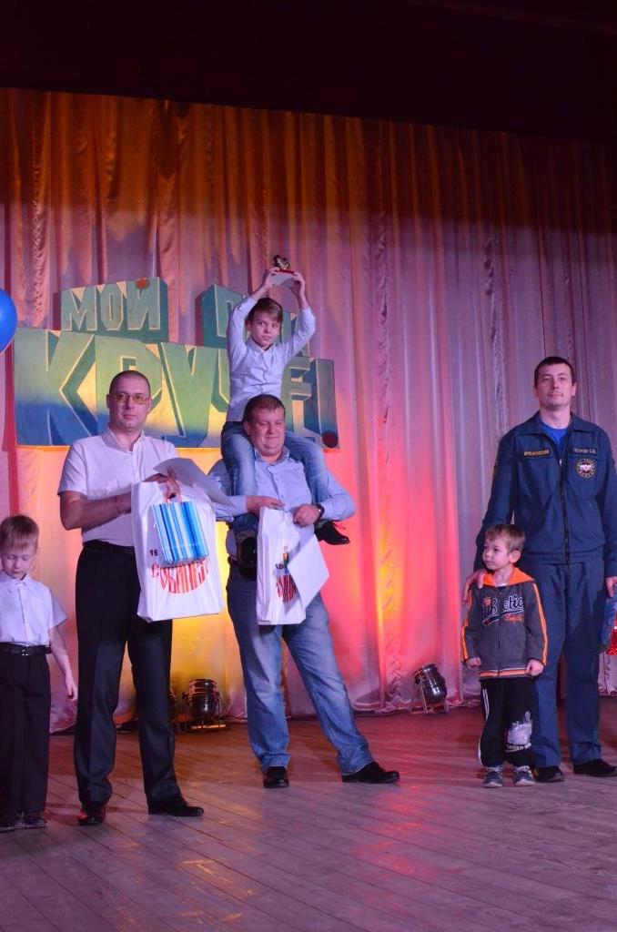 Настал самый волнующий момент – подведение итогов. На сцене появились члены жюри, которые поблагодарили всех участников, выразили свою признательность и перешли к награждению. Победителями городского конкурса «Мой папа круче!» стали Модины Денис Александрович с сыном Андреем. Им был вручен главный приз конкурса – кубок, а от спонсора – собинского бюро экскурсий и путешествий - победителям вручили сертификат на поездку в спортивный комплекс «Лужники» (г. Москва) на ледовое шоу Ильи Авербуха «Щелкунчик». Остальные папочки с сыночками были награждены в номинациях. Всем участникам были вручены призы от администрации города Собинки и еще одного постоянного спонсора мероприятий Дома культуры – индивидуального предпринимателя Алексея Владимировича Дмитриева (магазин «Универсам», отдел «Пластиковые окна»). А еще Алексей Владимирович подарил специальный приз Мартьяновым – сертификат на посещение батутного центра в городе Владимире.