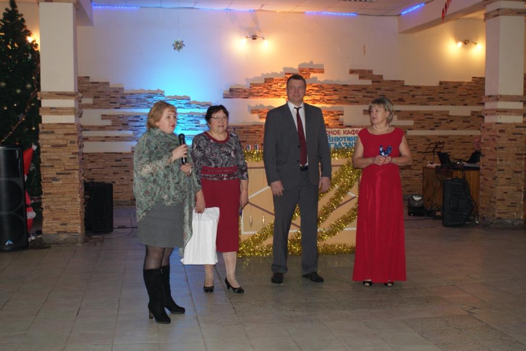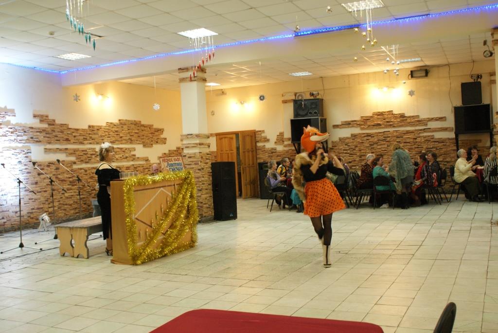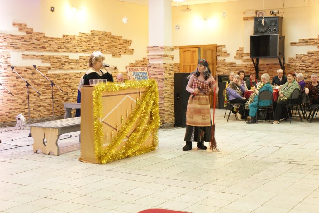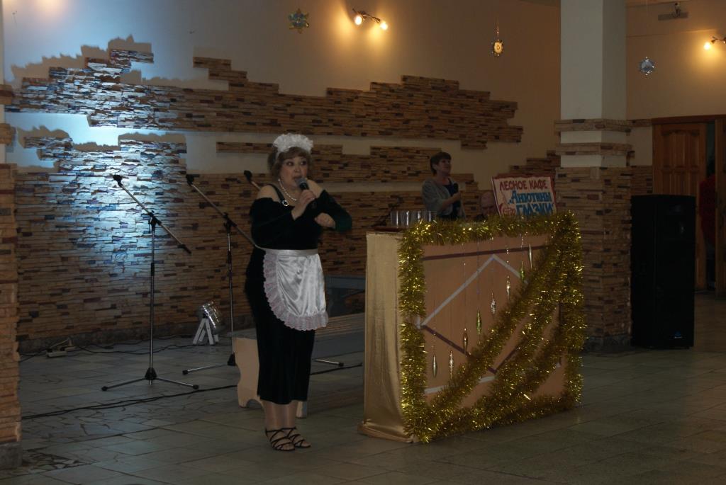 Потом все гости попали в Новогодний лес, где расположился лесной буфет «Анютины глазки», хозяйка которого Нюра (О.В.Чернец) вместе с Дедом Морозом (В.И.Туманов), Снегурочкой (А.Табанюк), Бабой Ягой (И.Р.Табанюк) и Лисой (Е.В.Ромашова) разыскивали персонажа – символа 2017 года – Петуха!