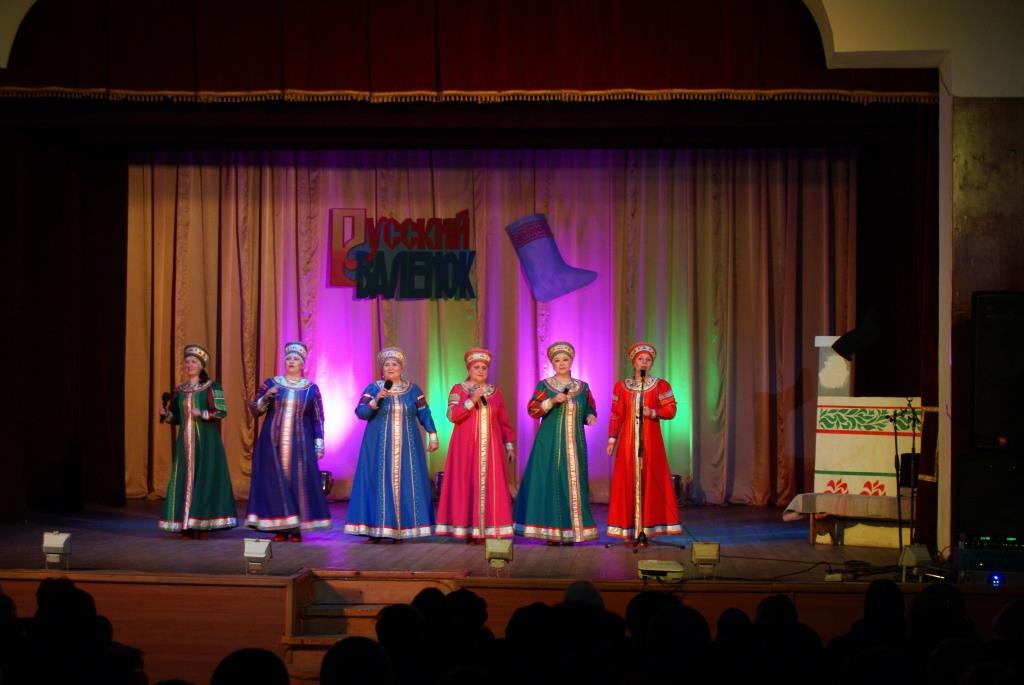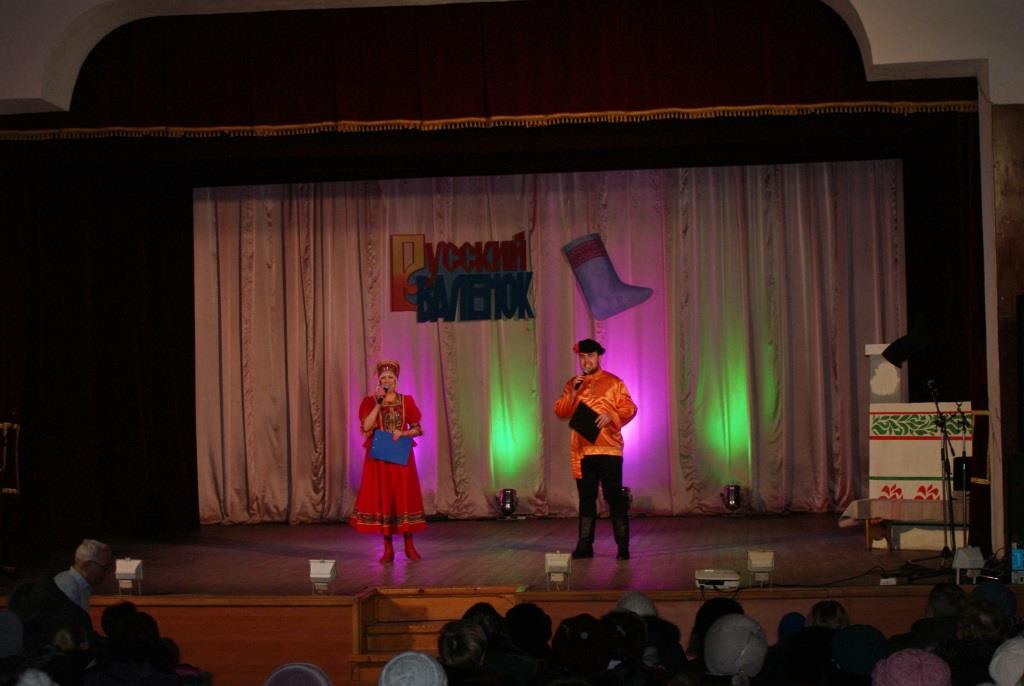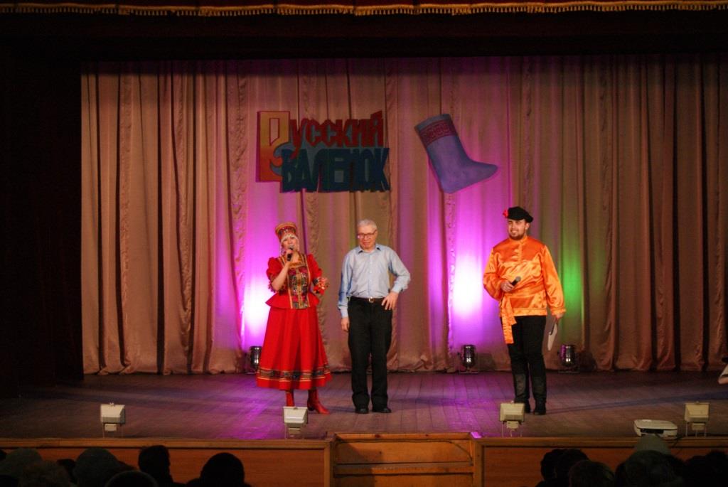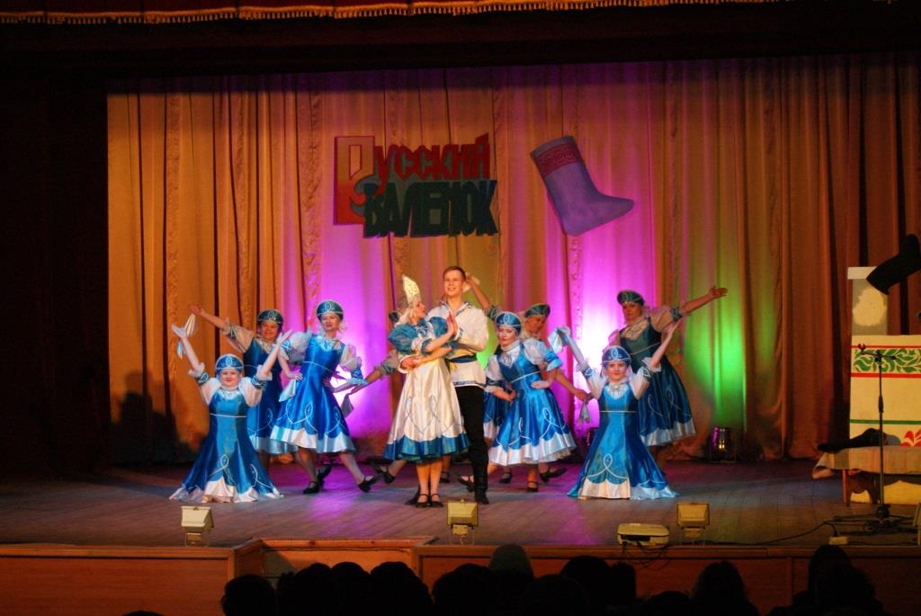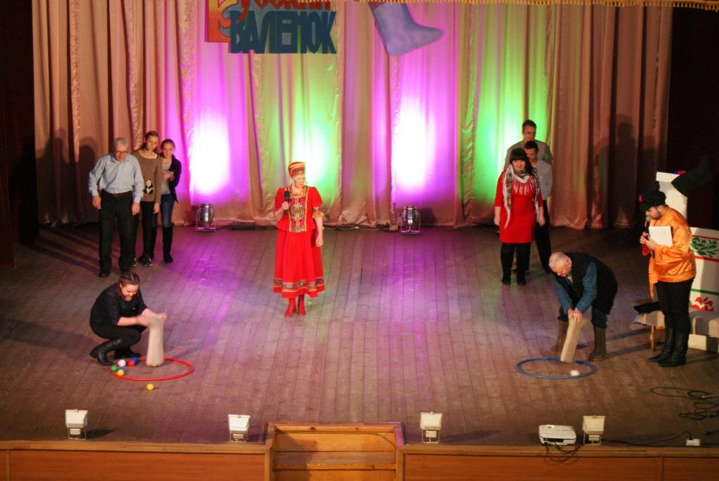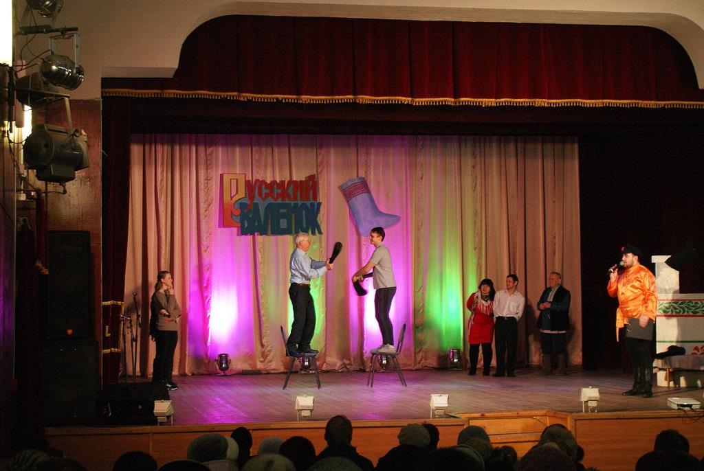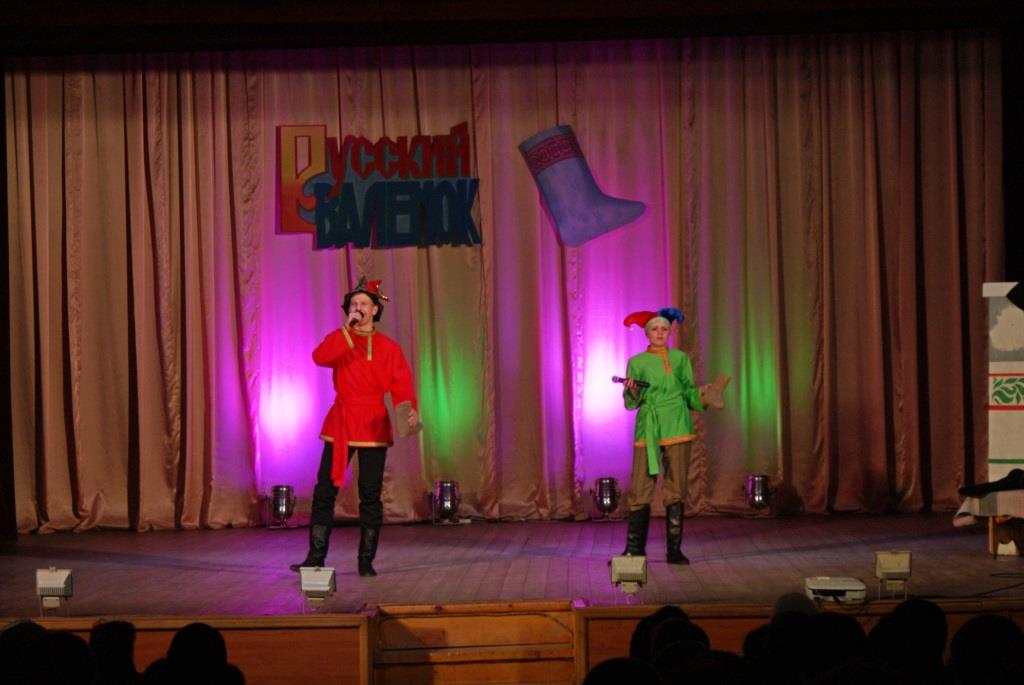 Ну, а весёлые Скоморохи: А. Мужикова и А. Мельничук- пригласили зрителей поучаствовать в увлекательных конкурсах и играх. Две команды: «Русские валенки» и «Калоши» соревновались в беге в необыкновенных «валенках-скороходах», играли в «хоккей», где роль клюшки выполнял валенок, участвовали в петушиных боях с валенками, а в конце наперебой рекламировали эту прекрасную русскую обувь. В завершении праздника всех гостей ждал сюрприз - видеоролик с песней «Валенки» в исполнении великой русской певицы Лидии Андреевны Руслановой. В программе так же принимали участие танцевальные коллективы ГДК: «Эврика» (рук. Г. Малов), «Экспрессия» (рук. А.Мужикова), эстрадно-фольклорный ансамбль «Русичи», Виктория Дубровкина и гости праздника: ансамбль народной песни «Ладушки» (рук. А. Козырева).