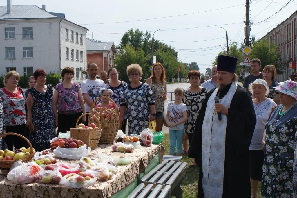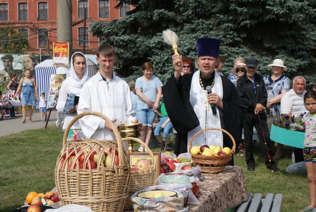 Прямо под открытым небом у всех на глазах происходило настоящее таинство: отец Виктор провёл традиционный обряд освящения плодов. Кроме яблок, окроплялись также виноград, груши, персики и другие фрукты.