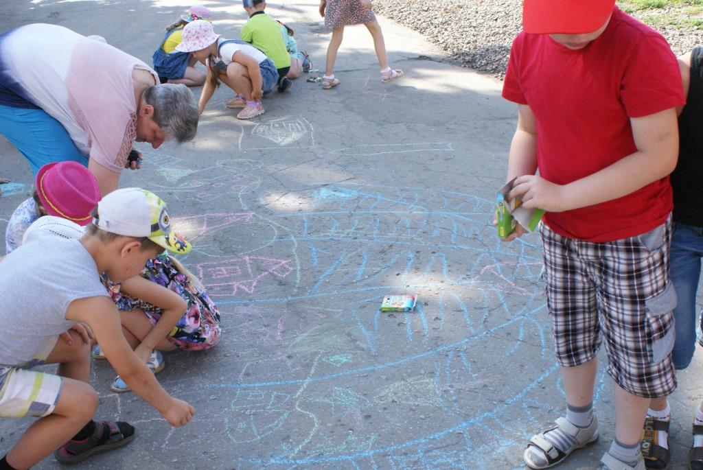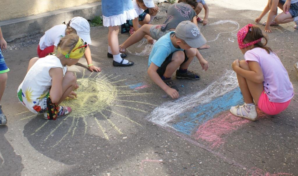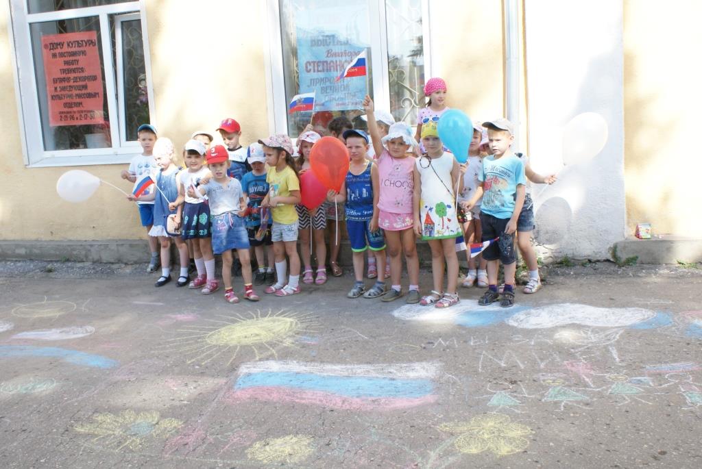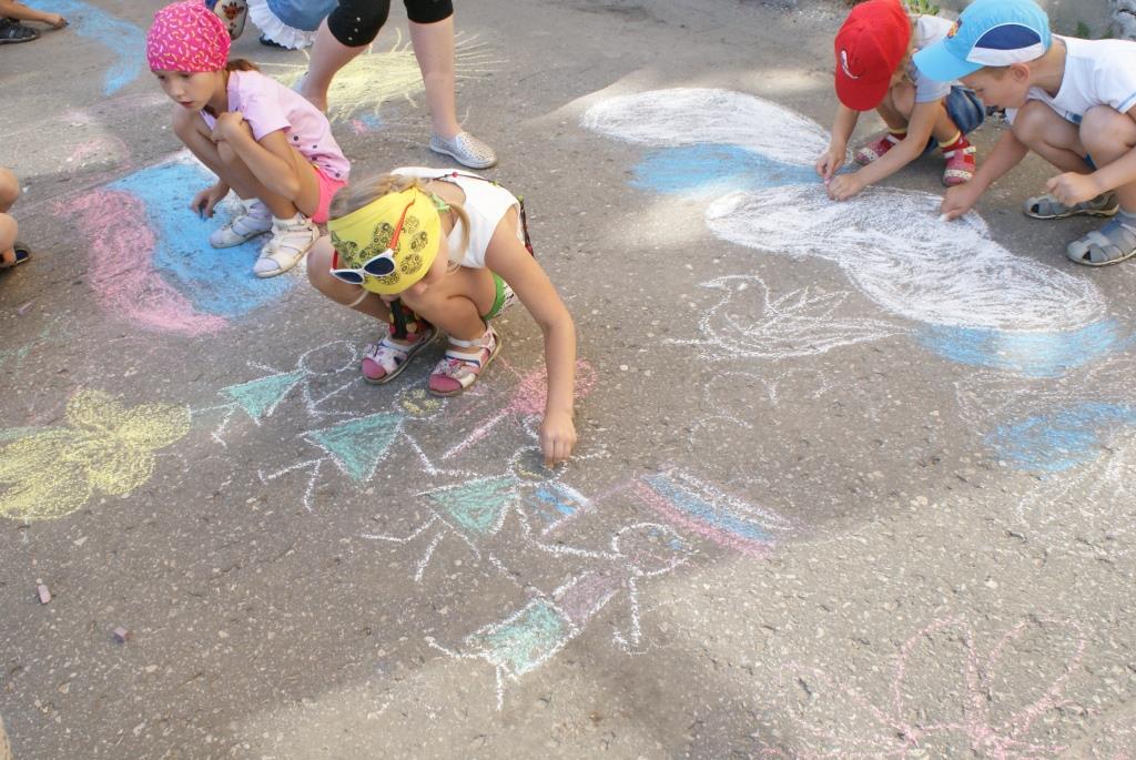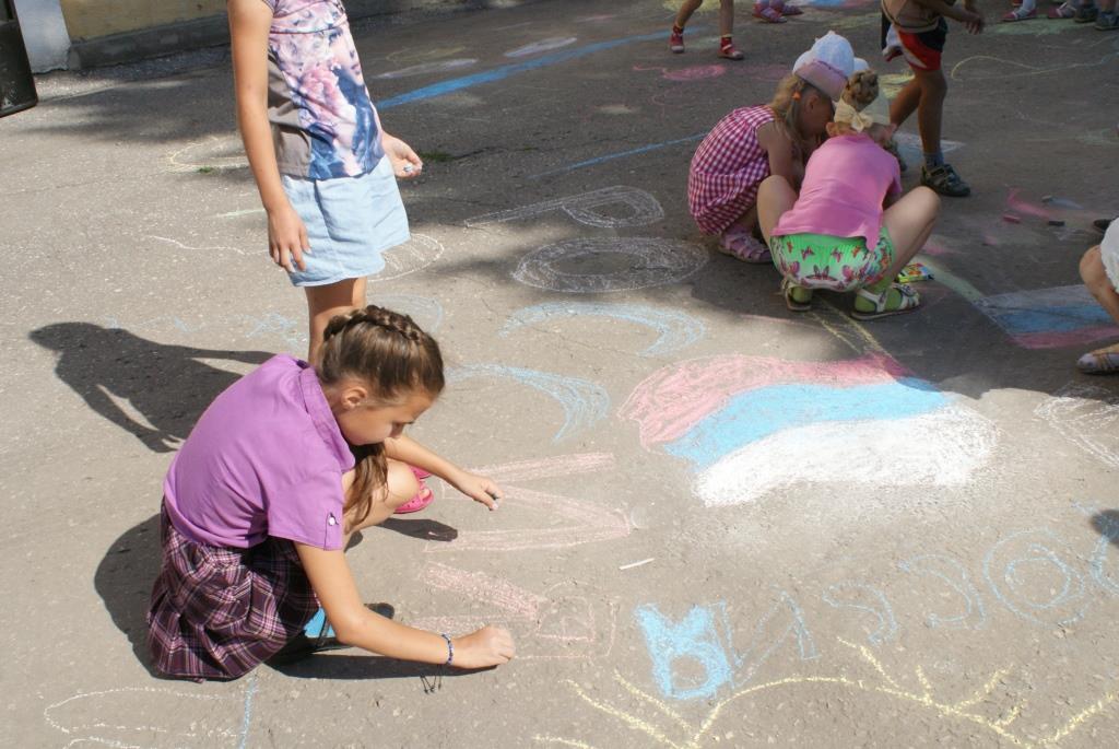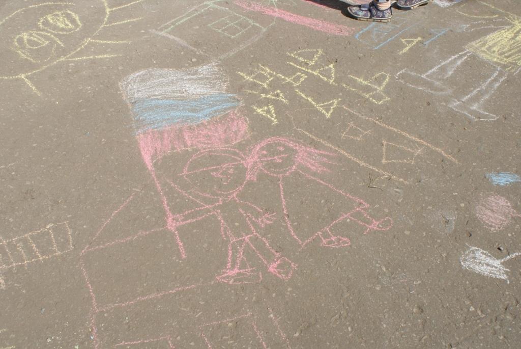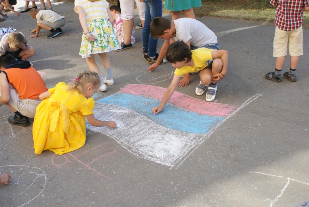 Ведущая провела с ребятами игру «Разноцветные флажки», а потом все приняли участие в конкурсе рисунков на асфальте «И гордо реет флаг державный!»
