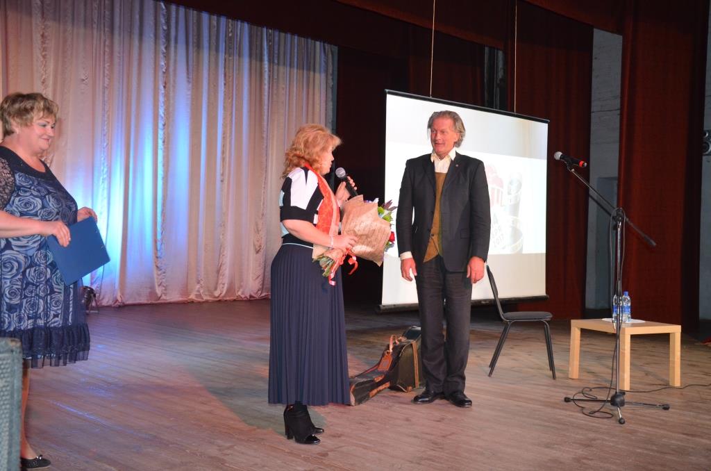 На встрече со зрителями в Доме культуры Сергей Колесников выступил и показал себя еще с одной стороны: отлично поет, хорошо играет на 12 струнной гитаре, имеет обворожительный голос и отменно владеет залом, создает теснейший контакт со зрителем! И, наверное, поэтому публика была в восторге от яркого, обаятельного, интересного, темпераментного и общительного артиста. А глава нашего города Е.Г.Карпова в знак признательности и благодарности вручила ему шикарный букет цветов.
