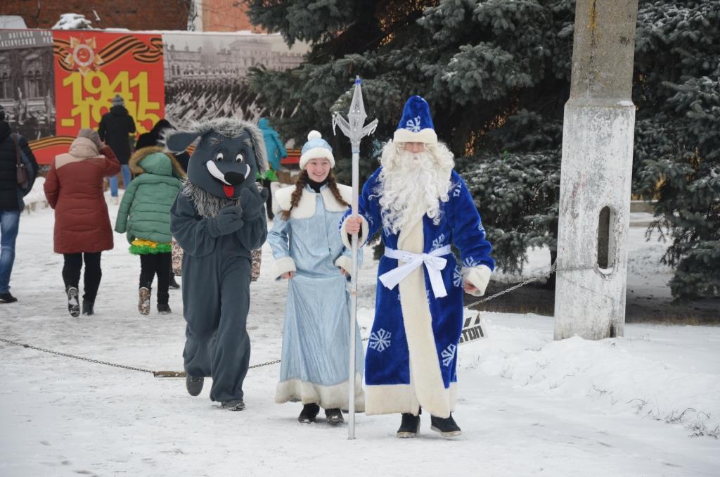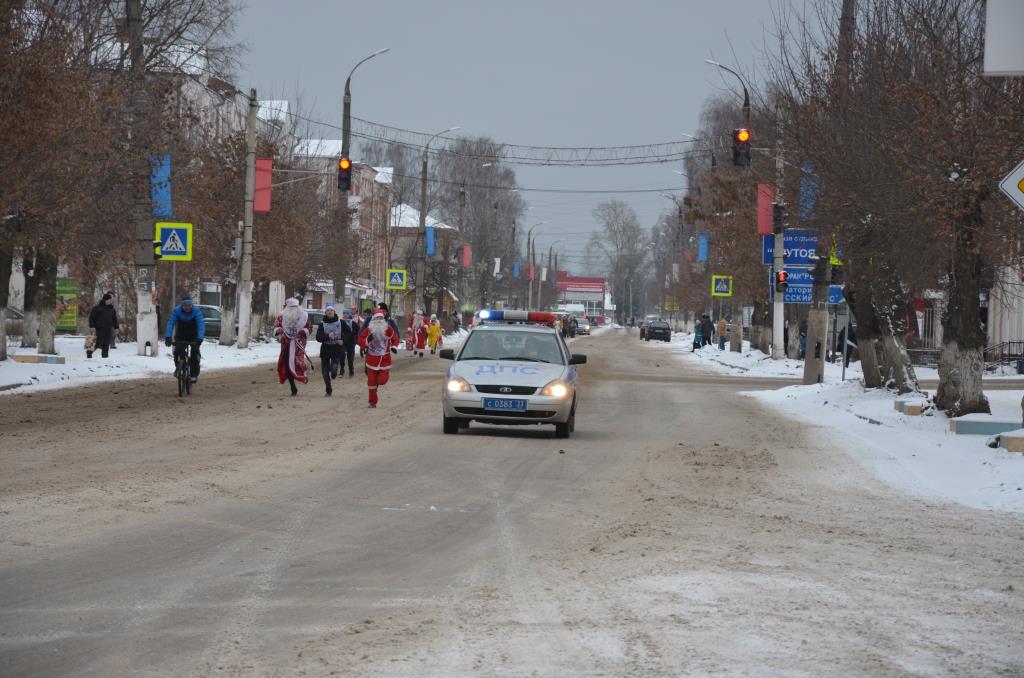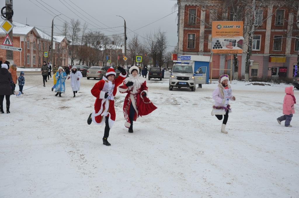 Деды Морозы, Снегурочки, собачки, динозавры, миньоны, олени, подушки и многие другие персонажи бежали по главной городской дороге шестого января.