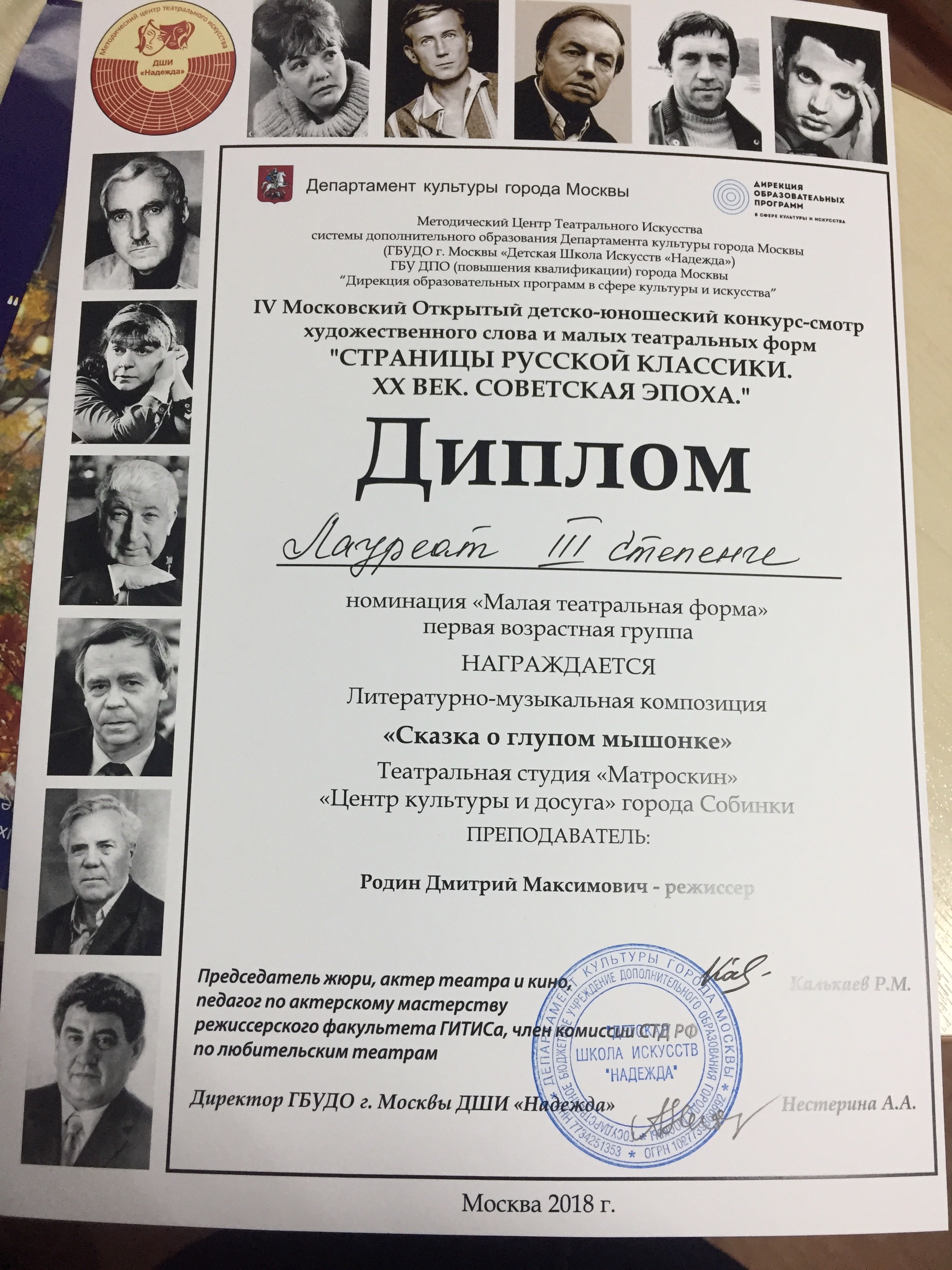 С 16 по 25 февраля в столице проходил IV открытый Московский конкурс-смотр «Страницы русской классики. XX век.» Среди участников - младшая группа театральной студии «Матроскин» (руководитель Д.М. Родин). Это первый театральный конкурс у маленьких актёров.