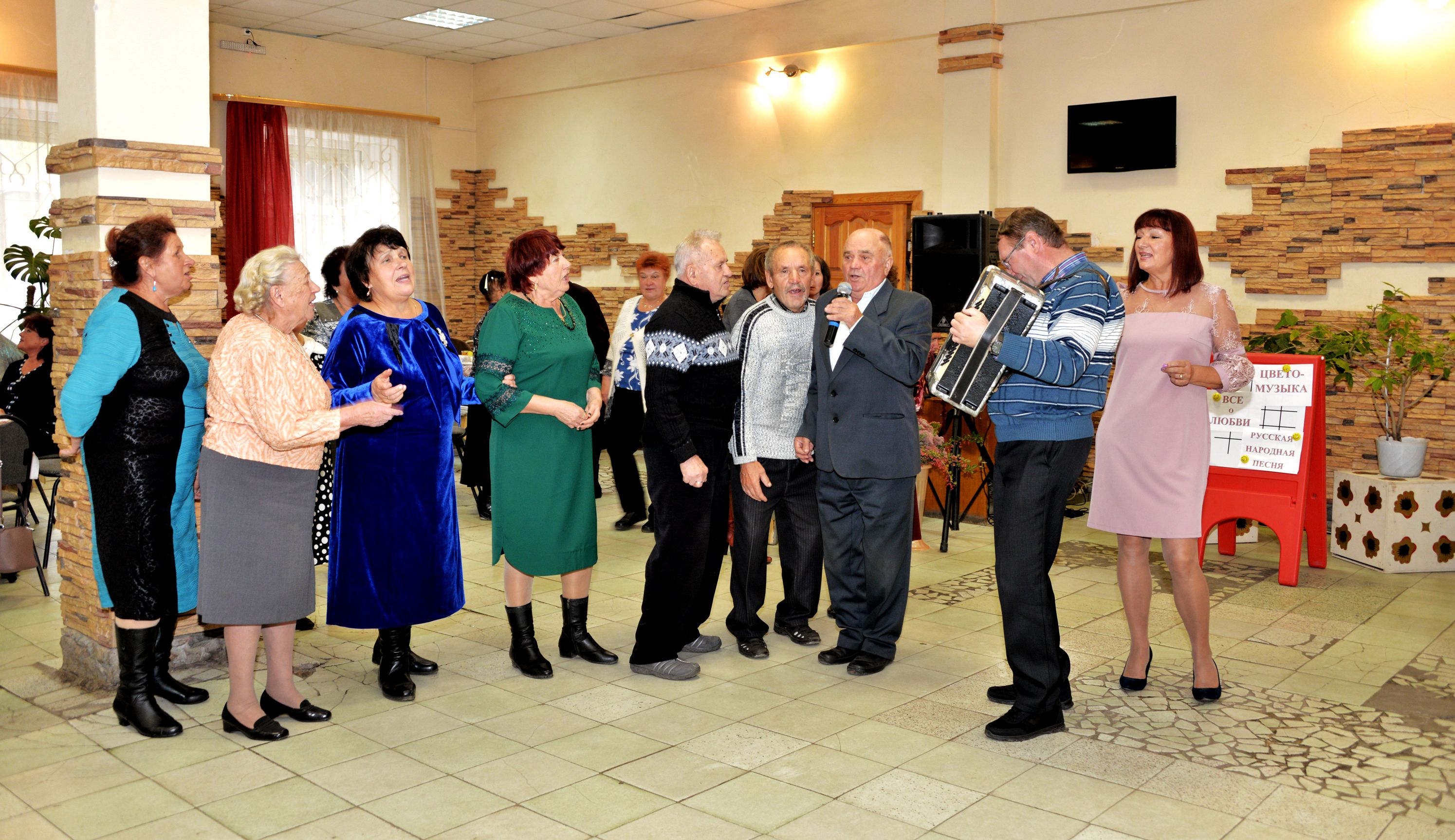 Теплая, душевная обстановка и музыкальный настрой ведущих Галины Суфьяновой и Ирины Табанюк сразу объединили всех присутствующих. Поприветствовали всех, кто находился в зале, заведующая отделом по социальным вопросам администрации г.Собинка Е.В.Мизелева и председатель Совета Ветеранов Н.Быстрицкая. Много теплых слов и поздравлений сказали они в адрес присутствующих. Порошина Александра Васильевна, которой на момент мероприятия уже исполнилось 82 года, подарила всем гостям вечера замечательные стихи. Ну а дальше было море песен, игр и танцев. Играли в «Угадай мелодию», а также весёлой и забавной оказалась игра «Без слов понятно», в которой командам предлагалось с помощью пантомимы изобразить строчку из песни. Иногда ответ был незамедлительным, а в некоторых случаях пришлось немного и подумать. Пели много, пели дружно, в том числе и в игре «Вспомни и напой», в которой предлагалось ответить на заданный вопрос строчками из песен. И конечно же, не обошлось без танцев. Вальс, танго, цыганочка,7-40, рок-н-ролл, современная музыка - под все эти направления с удовольствием танцевали участники вечера. Не обошлось и без традиционных частушек, в сопровождении Владимира Полетаева на аккордеоне. Музыкальные подарки всем присутствующим подарили солисты Дома культуры А. Дубровкин, Т. Чекурина, О. Чернец, Ф. Бункина. Песни в исполнении хора ветеранов ДК от первого слова до последнего исполняли всем залом. Вечер закончился, также, как и начался, в очень теплой и дружной обстановке и обещаниями встретиться вновь.