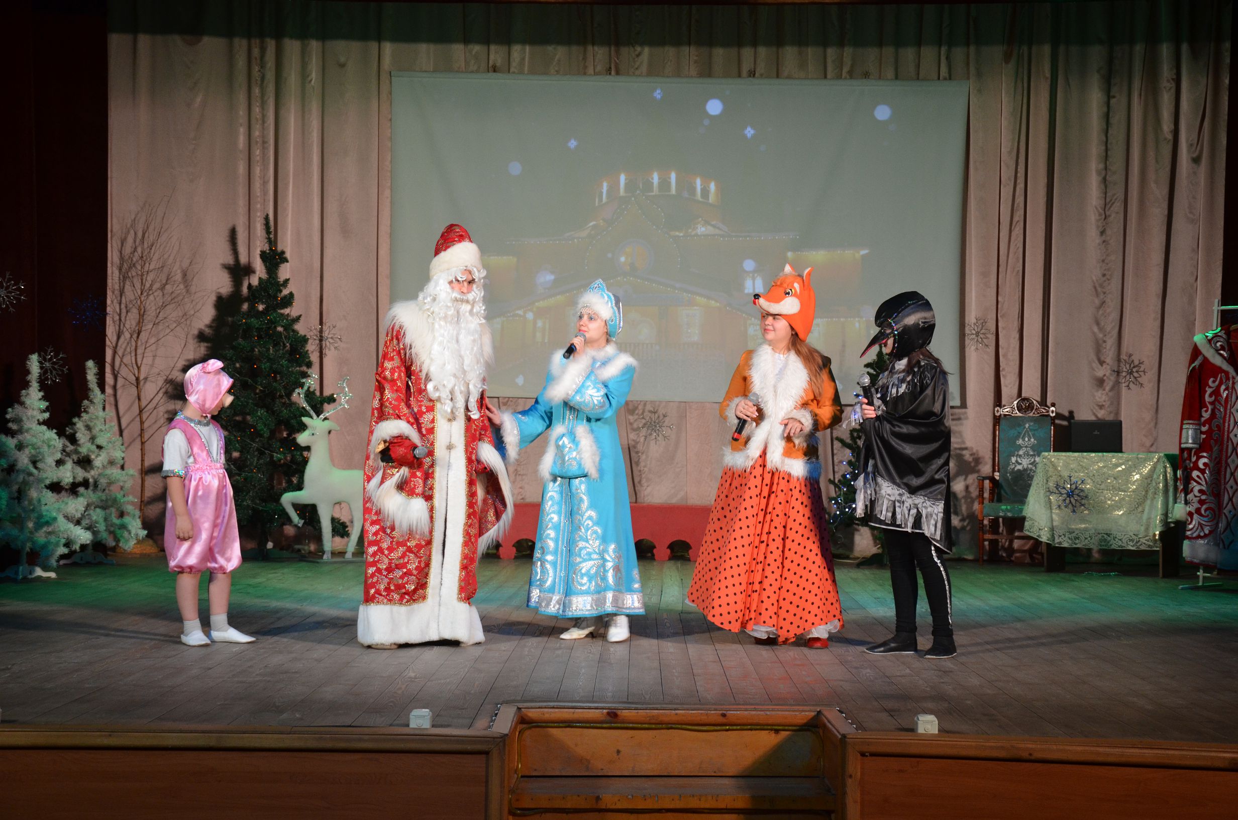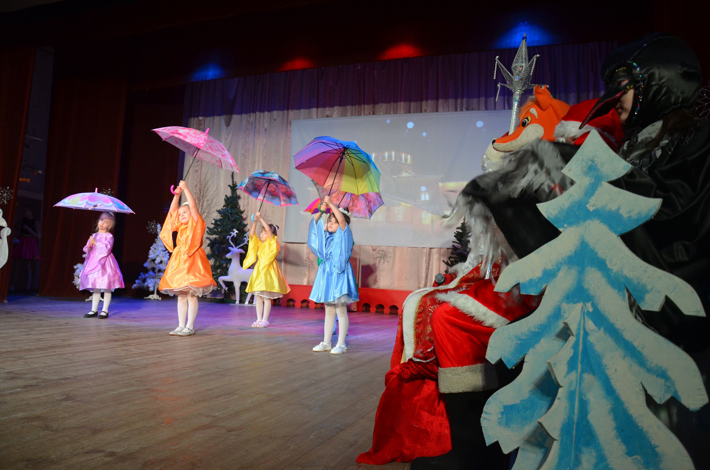 Дети и Сказочные Деды морозы встретились на уже ставшем традиционным празднике, День рождения Деда Мороза.Сказочная Ворона (Лиза Дементьева) и хитрая Лиса (Вика Миронычева) ,очень долго спорили о том, что подарить Деду Морозу на День рождение. Сказочница (Боубатрын С.В.) пыталась весёлыми играми с детьми , помирить спорщиц. Это удалось только маленькому Хрюшке ( Валера Дементьев).Все музыкальные подарки в исполнении вокальной студии «Куликово болото»,Н/А бального танца «Эврика»,хореографического ансамбля «Экспрэссия»,очень понравились Деду Морозу и Снегурочке. Дети дружно поздравили Деда Мороза наполнили его мешок подарками и письмами с Новогодними пожеланиями. Праздник получился весёлым и ярким. Дети были довольны , а Дед Мороз пригласил всех на новое Новогоднее представление.
