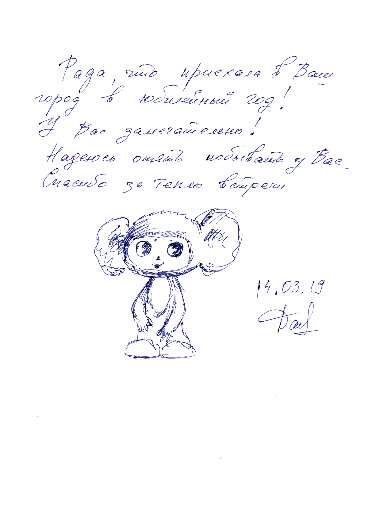 14 марта здесь прошла встреча с доцентом Всероссийского государственного института кинематографии, Заслуженным деятелем искусств РФ Наталией Борисовной Дабижа, "мамой Чебурашки и Шапокляк". Именно Наталия Борисовна смастерила куклы для известных с детства мультфильмов.