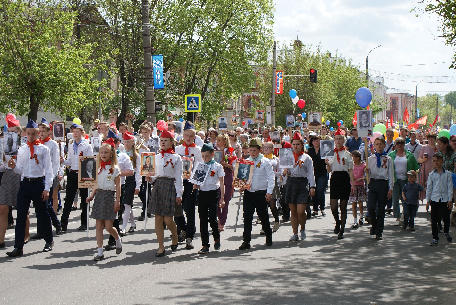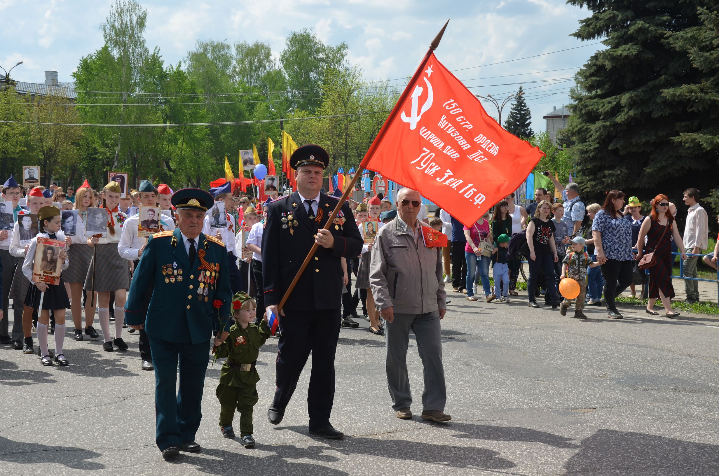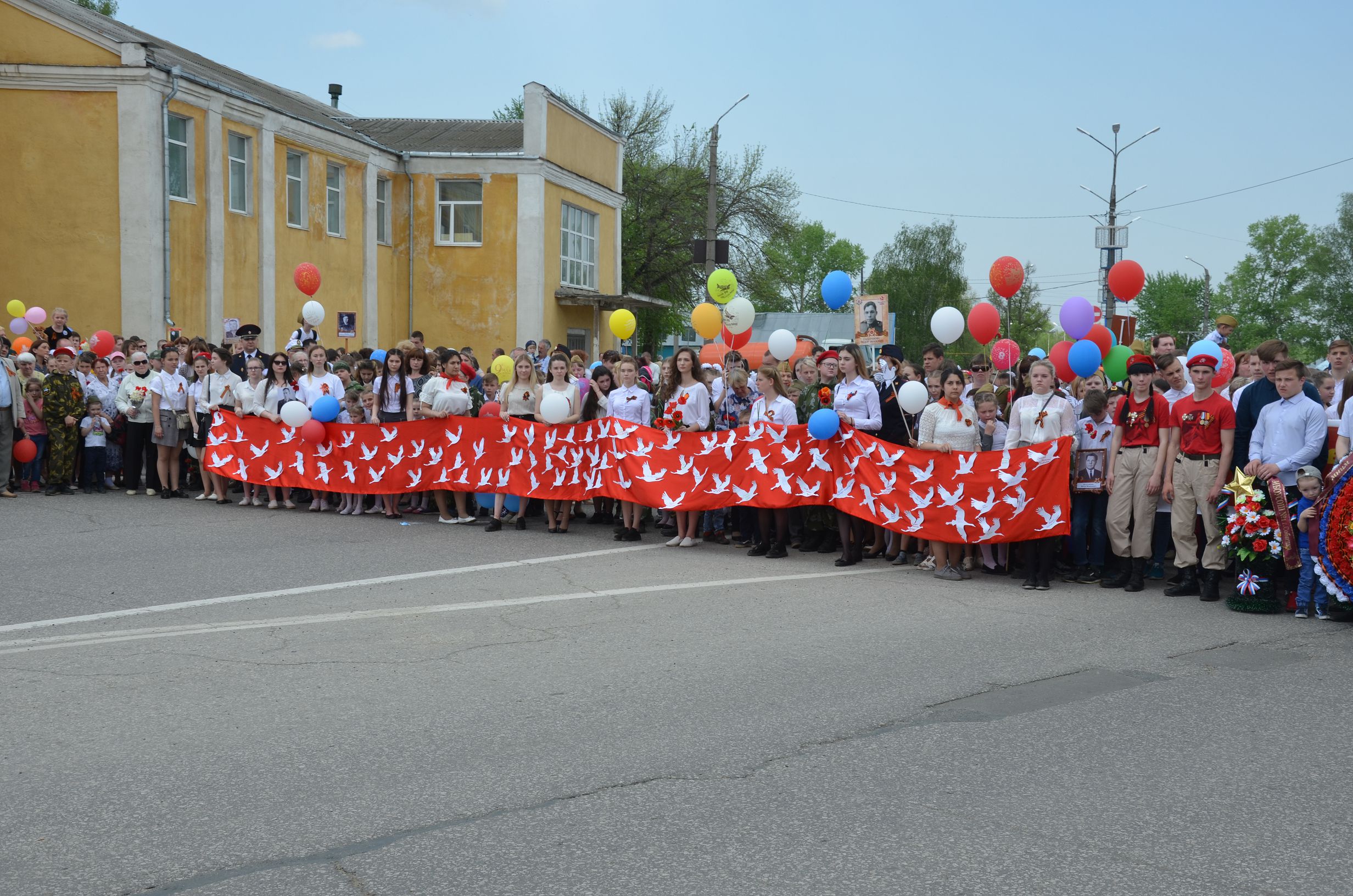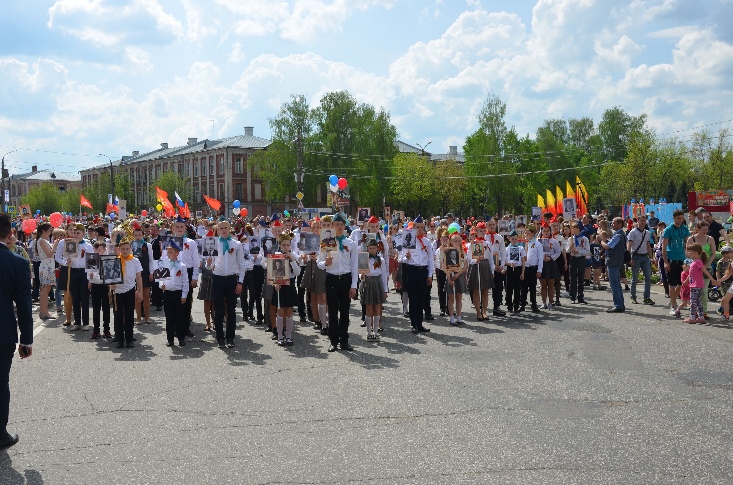 Во время завершения трансляции главного Парада страны в нашем городе началось построение для проведения торжественного шествия, которое по традиции завершается митингом у мемориала погибшим воинам. Колонна собинцев во главе с ветеранами и детьми двинулась по главной дороге. Играл оркестр. Чувства праздника не передать словами: гордость за воинов – победителей, за нацию переполняли каждого.