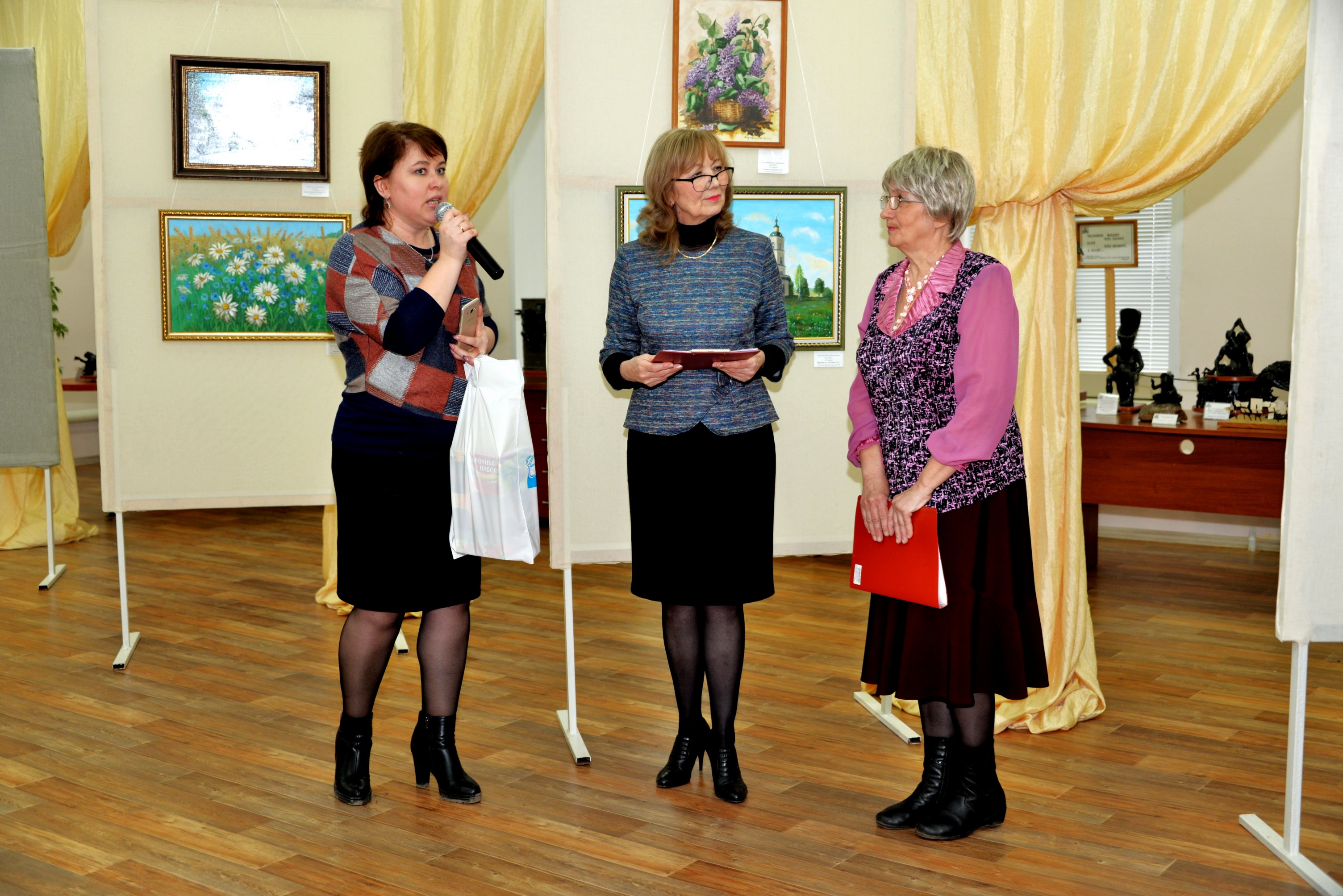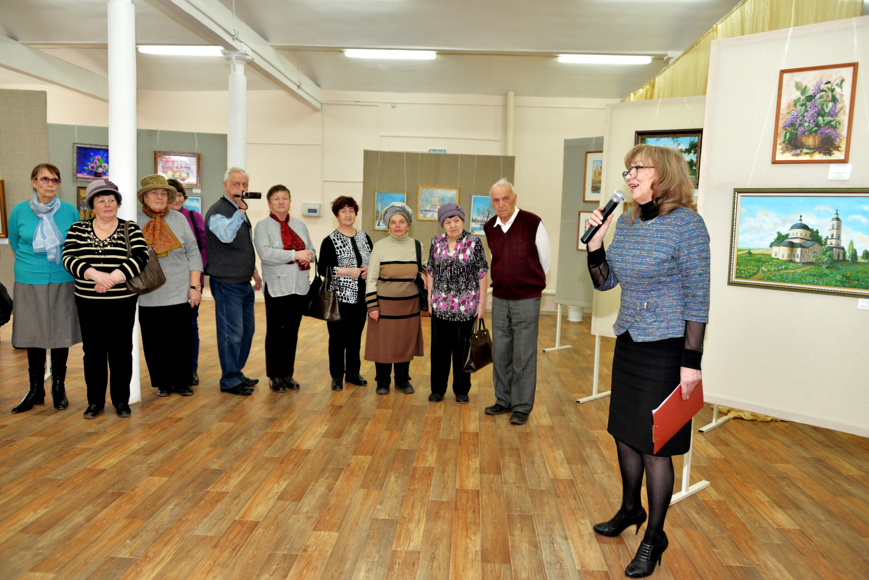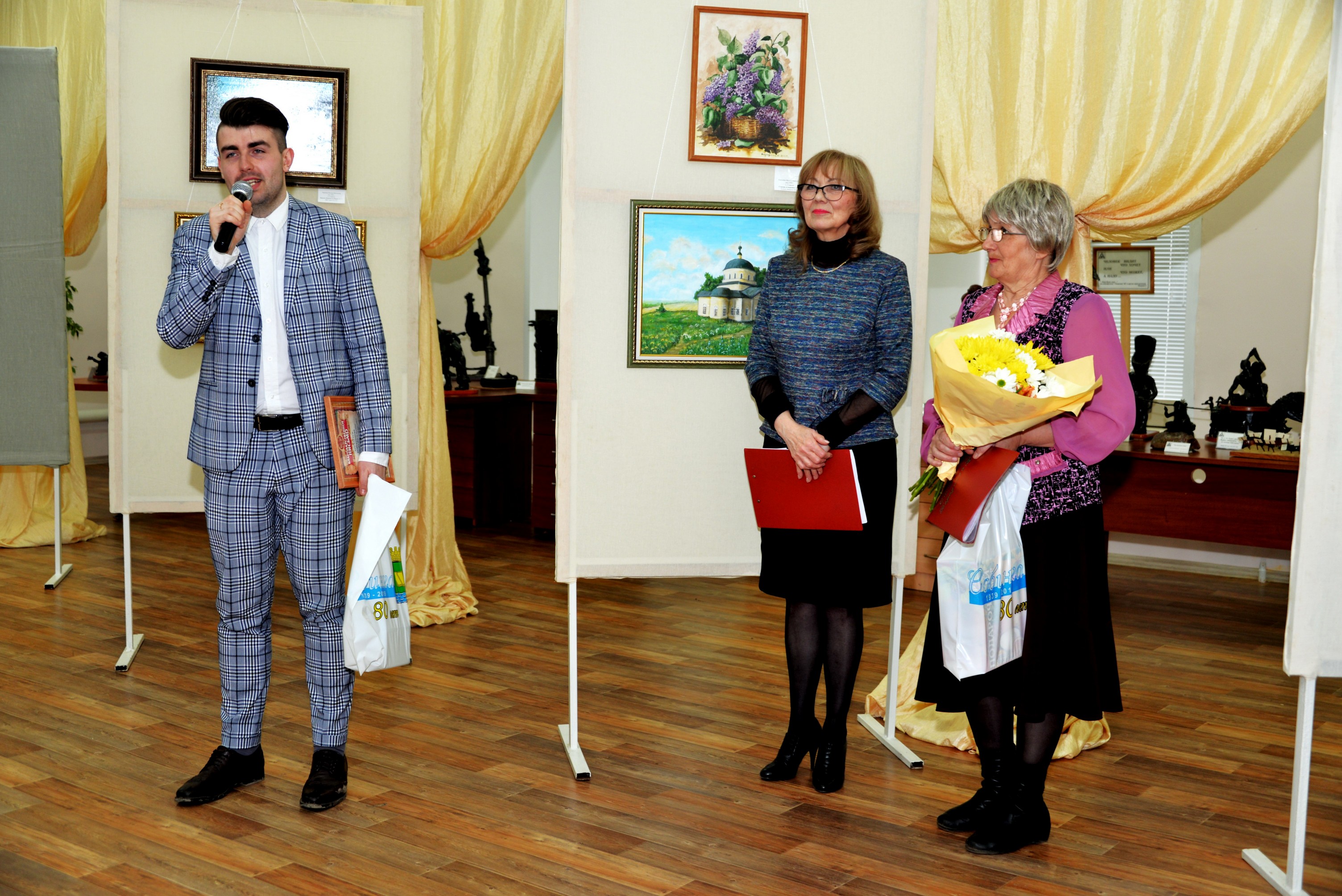 Добрыми словами приветствия и благодарности встретили художницу заместитель главы города Канайлова Елена Николаевна и директор Дома культуры Родин Дмитрий Максимович. Прозвучали стихи в исполнении поэтов Надежды Долбиловой и Виталия Прадеда.