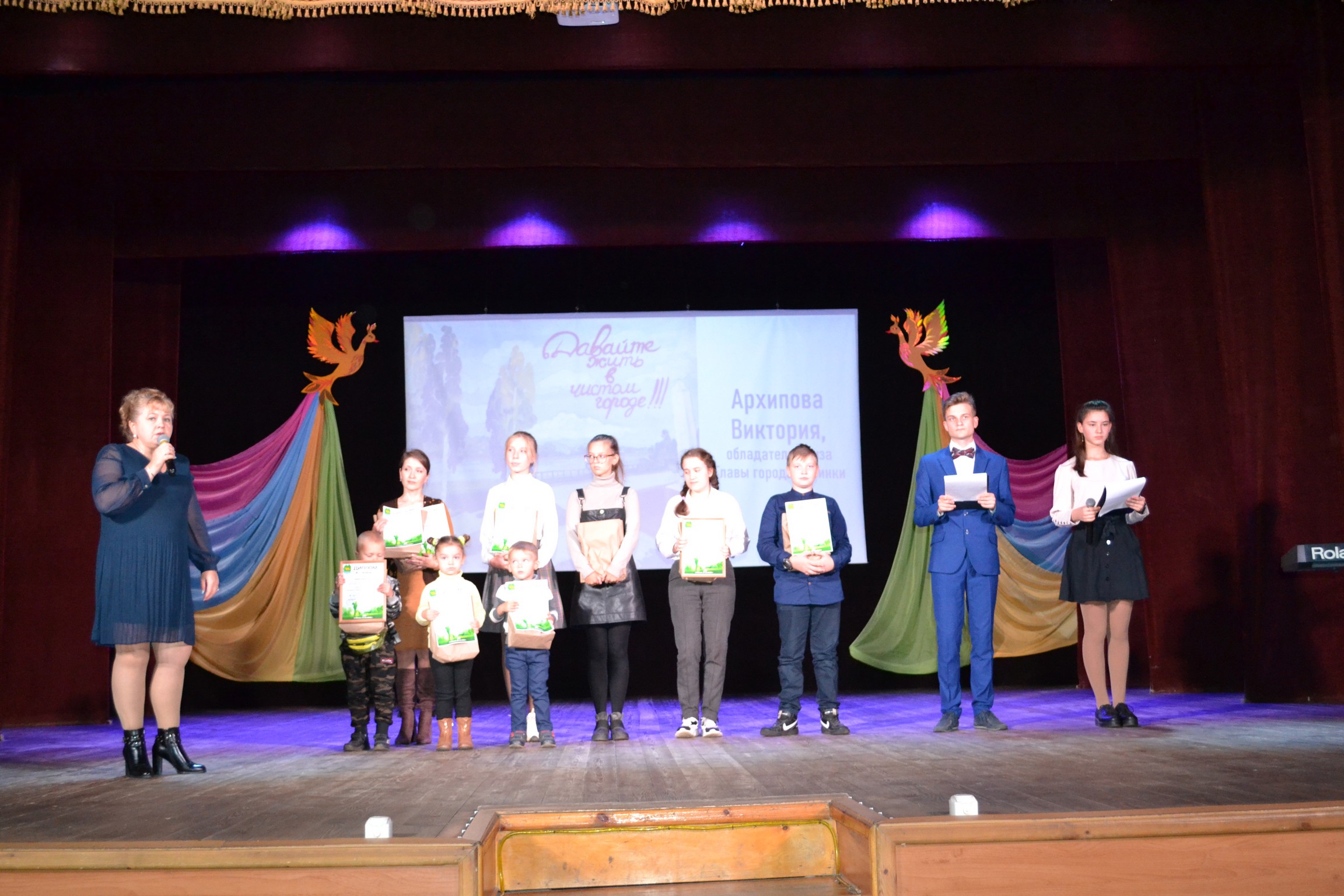 С приветственным словом выступила Глава города Елена Геннадьевна Карпова, наградив победителей. Дипломом 3 степени отмечен воспитанник детского сада № 4 Бадалов Егор, дипломом 2 степени - воспитанник детского сада № 4 Антонов Даниил, диплом 1 степени - учащаяся школы № 4 Евстигнеева Виктория. Обладателем приза Главы города Собинки стала Архипова Виктория, учащаяся школы № 4 города Собинки.