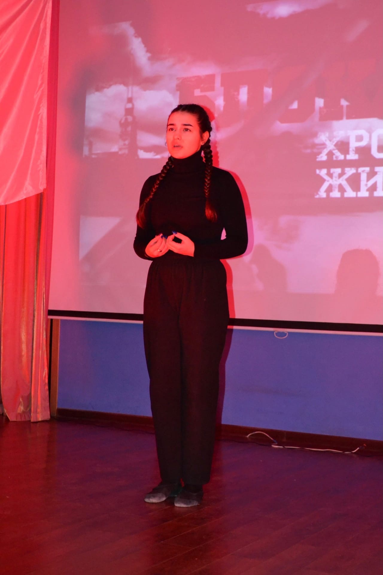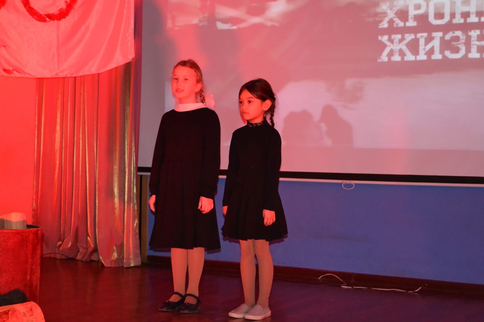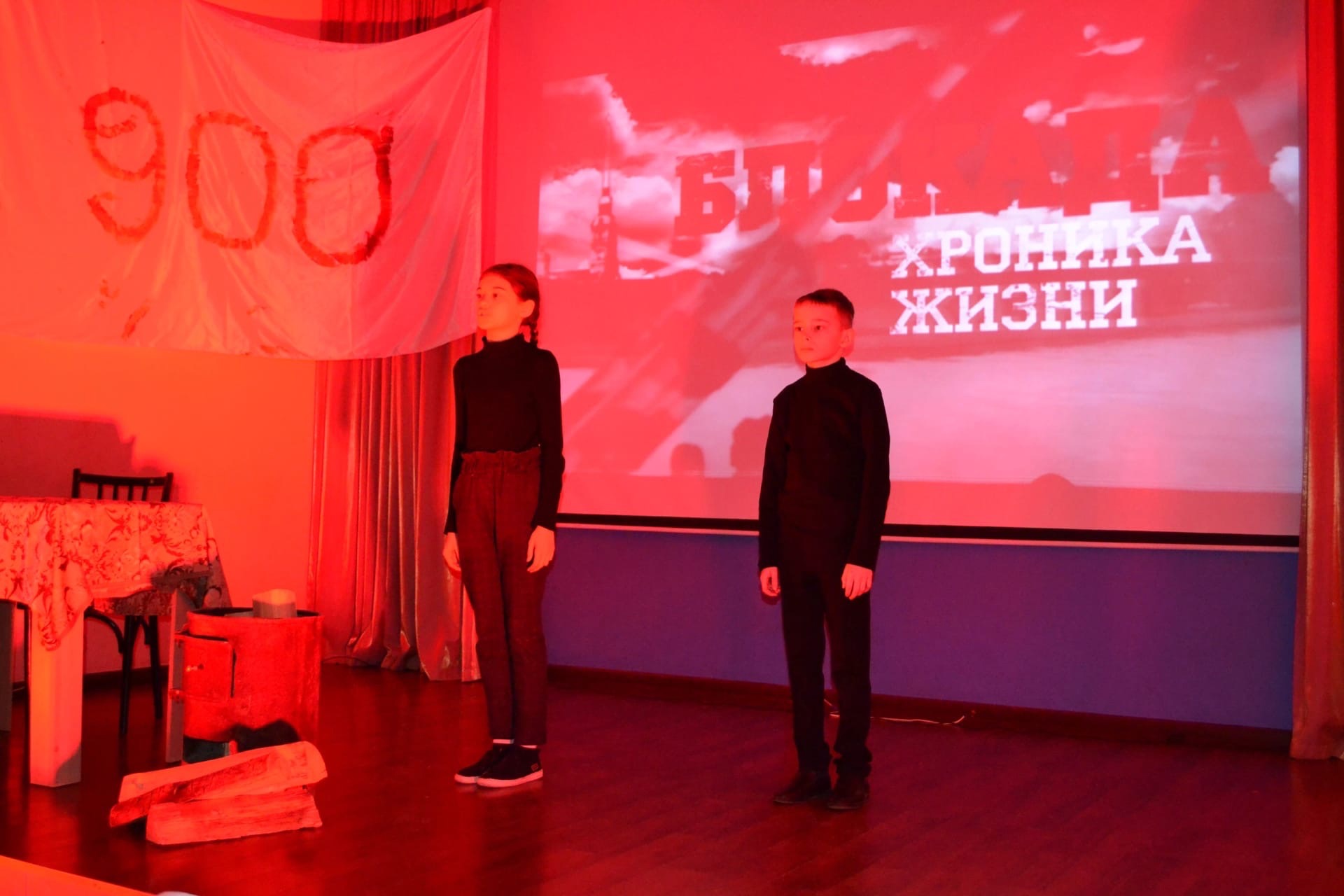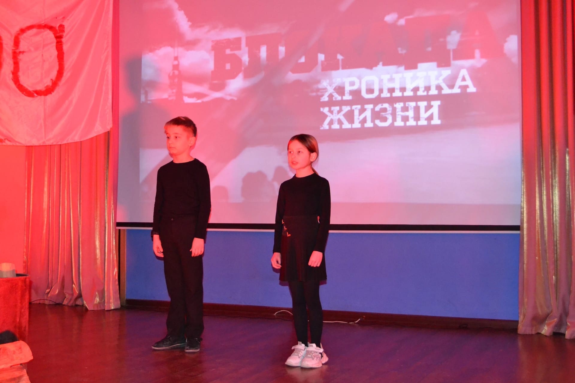 Воспитанники «образцового» театрального коллектива «Матроскин» рассказали молодому поколению города о тяжелых испытаниях, выпавших на долю жителей осажденного закрытого города Ленинграда: о голоде и холоде, о детях и женщинах, работавших наравне с мужчинами на заводах, о защите и обороне Ленинграда советскими солдатами. Особенными чувствами ребята прониклись к судьбе маленькой девочки Тани Савичевой. Её дневник стал одним из символов Великой Отечественной войны. Вниманию присутствующих были представлены кадры видеохроники.