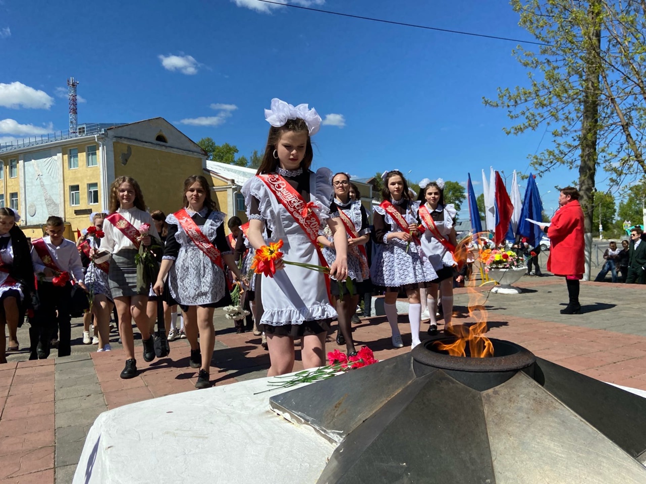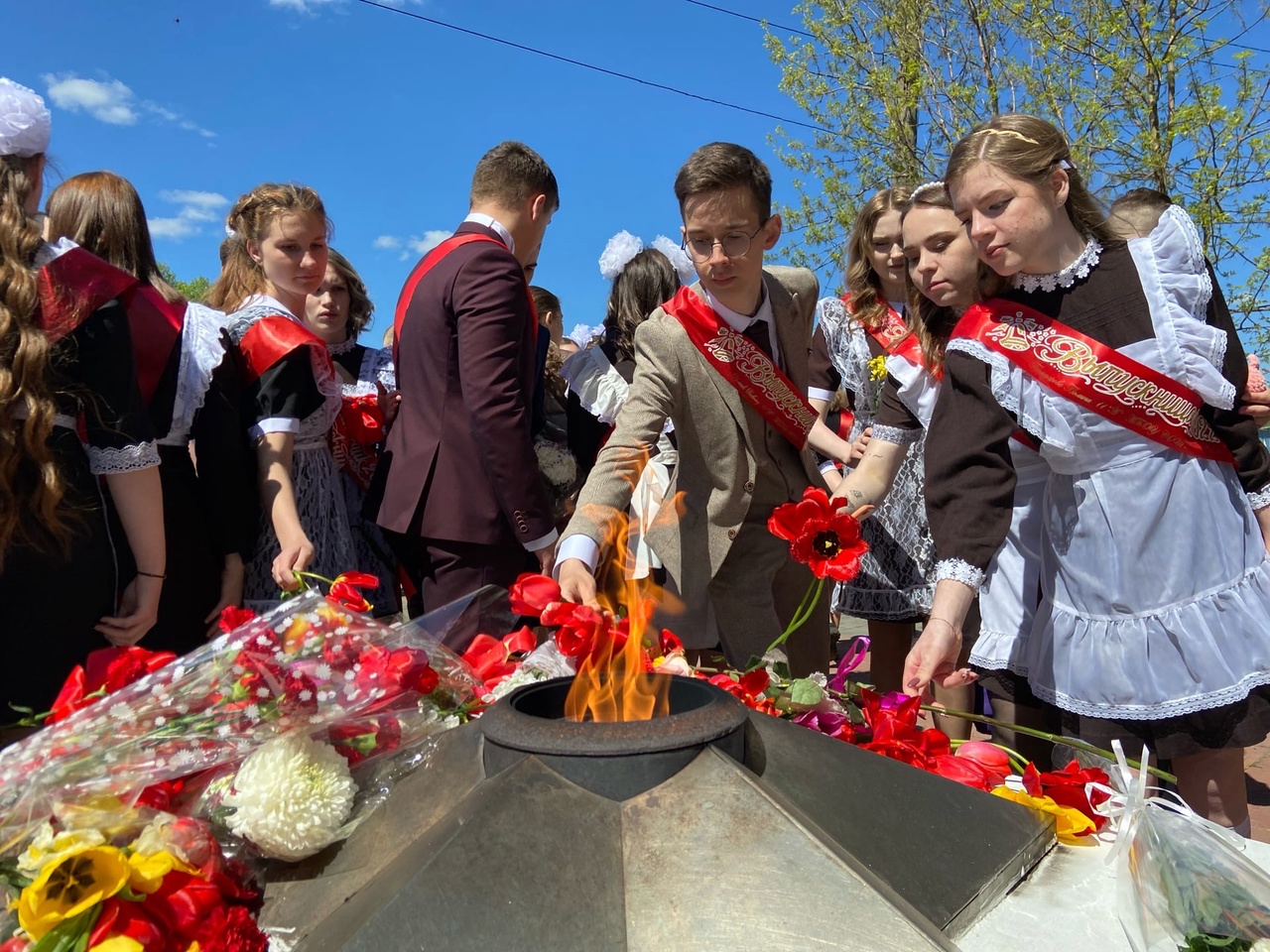 Возле мемориала воинам Великой Отечественной войны ребята запустили шары как символ мира, символ дружбы, созидания и исполнения мечты. А в память тех, кто стоял насмерть, тружеников тыла и детей войны, ковавших победу и не доживших до сегодняшнего дня, выпускники возложили цветы к Вечному огню.
