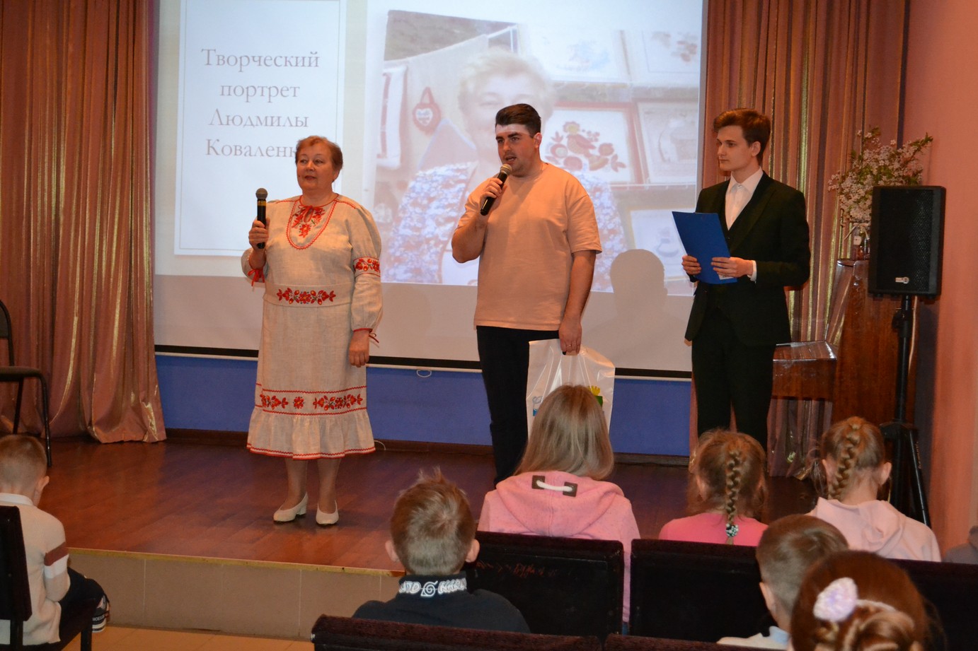 Следующий день подарил вторую встречу с творчеством: зрителю был представлен творческий портрет Людмилы Павловны Коваленко, человека талантливого и в поэзии, и в музыке, и в декоративно-прикладном искусстве. Ведущий мероприятия Скосырев Максим представил многогранный образ Людмилы Павловны, ребята из театральной студии «Драма» исполнили стихотворения из нового сборника «Огуречные забавы», а Ирина Табанюк - песню «Рукоделие моё» (автор текста и музыки – Л.Коваленко). Сама Людмила Павловна читала свои стихи, отвечала на вопросы ведущего и пела свои песни. Завершением мероприятия стало посещение авторской выставки творческих работ Л.Коваленко, выполненных в разных техниках вышивки.