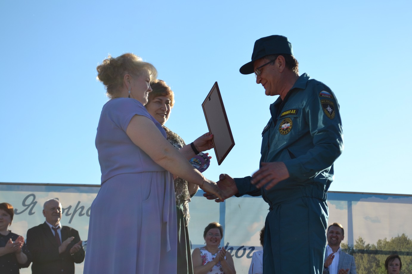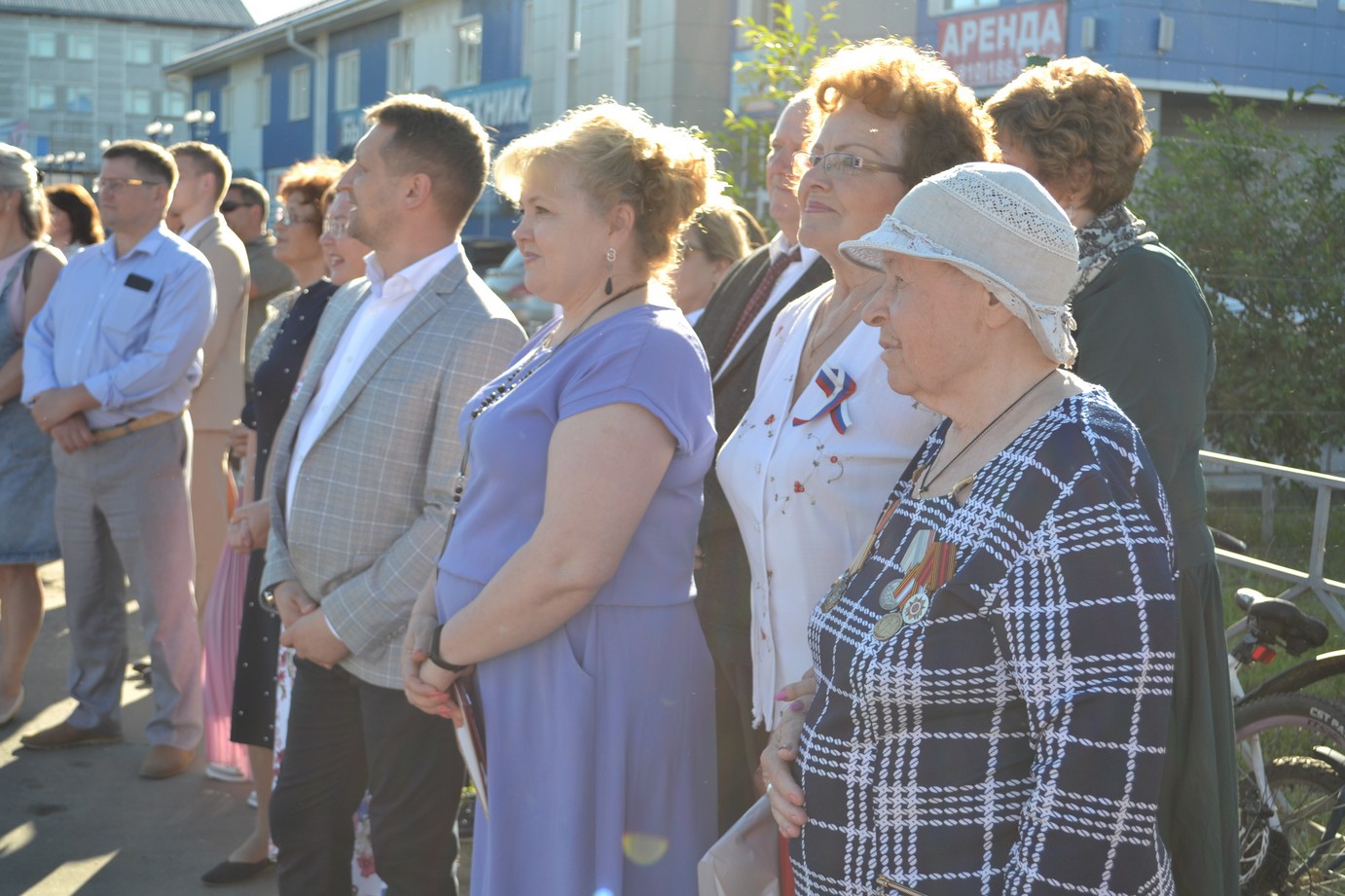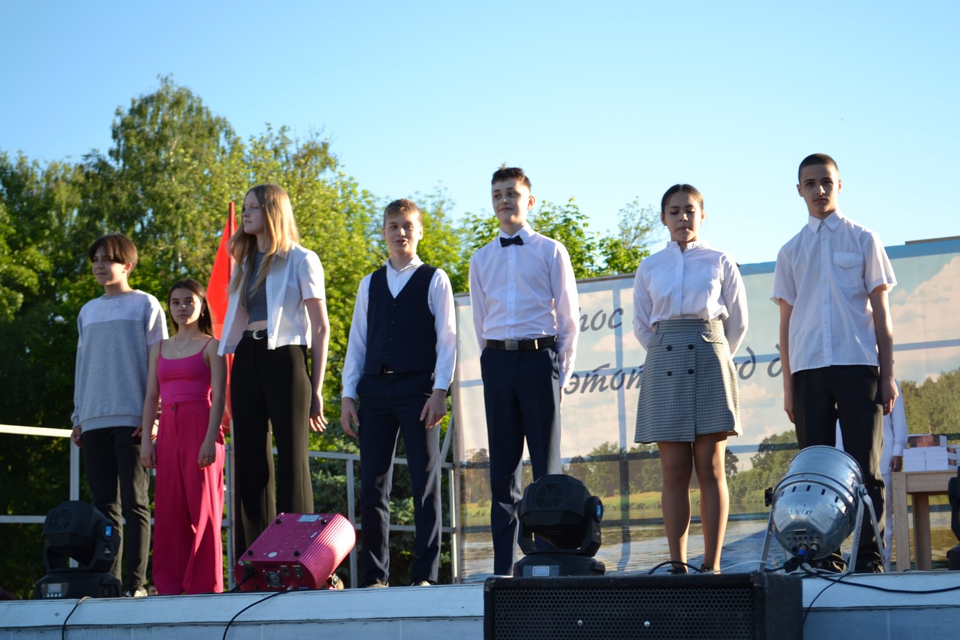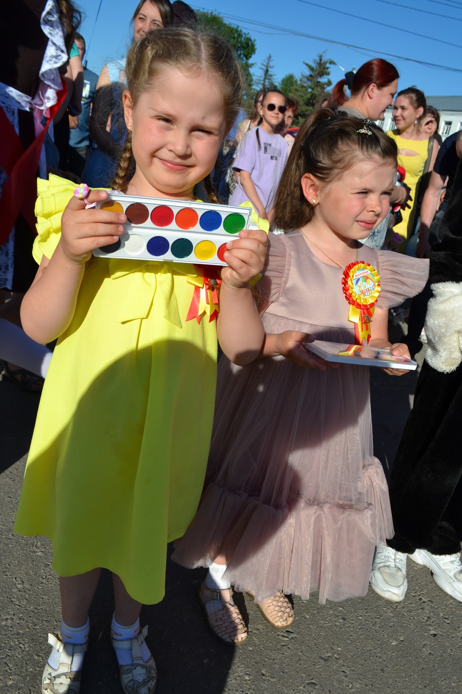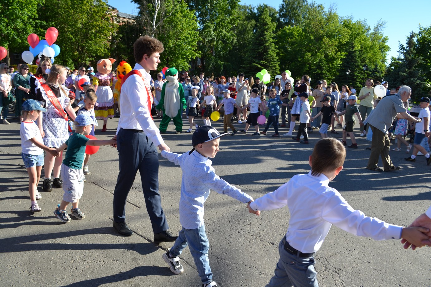Вечером юные жители города и их родители стали участниками шествия «Одно лето до школы». Праздничная колонна, украшенная разноцветными шарами и флагами, в сопровождении ростовых кукол - героев российских мультфильмов, прошла по центральной улице города. На площади будущих первоклассников школьным вальсом встречали выпускники 11 класса. Продолжилось праздничное действо дружным хороводом и вручением подарков – волшебных акварельных красок.